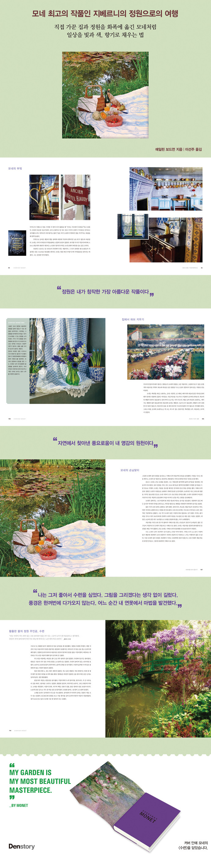 야외 활동 전문가이자 미식가였던 모네가 지금 살아있다면, 우리가 날마다 자연과 좀 더 가까이 지낼 수 있는 방법을 알려주고 싶어 할 것이다. 모네 대신 이 책이 여러분을 좀 더 자연으로 나가갈 수 있도록 이끌어 줄 것이다.