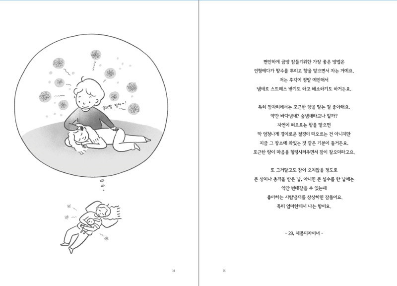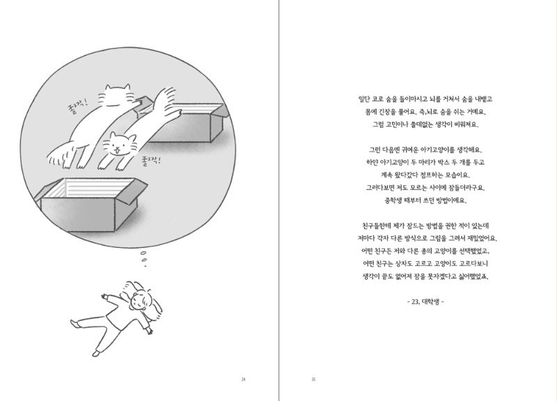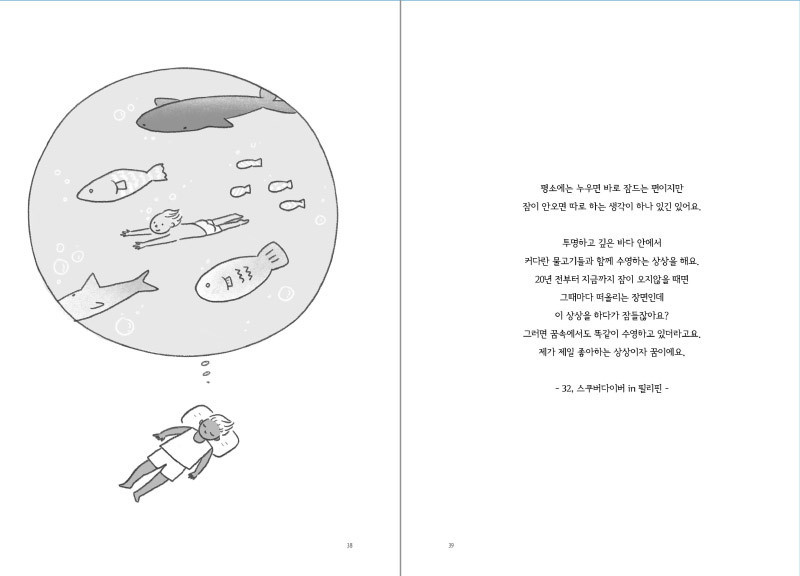 그리고 약 60가지의 저마다 잠드는 방법을 모았죠. 제 상상을 덧댄 그림과 함께요.