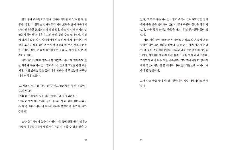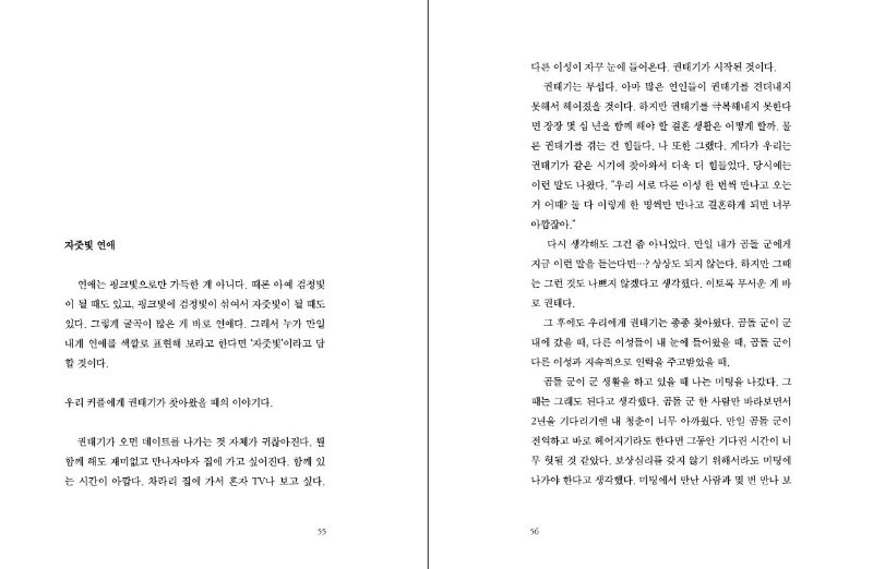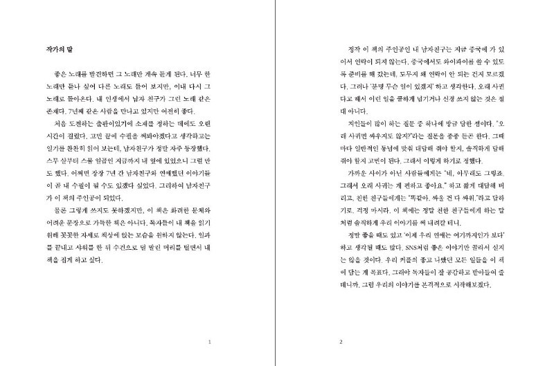7년 간 연애하면서 있었던 일들을 가감없이 담은 책입니다. 좋았던 일이라고 해서 더 예쁘게 포장하지 않았고, 좋지 않았던 일이라고 해서 생략하지 않았습니다. "오래 연애하면 어때?"에서부터 시작해, 처음 보는 사람들의 쏟아지는 질문에 그저 이 책 한 권을 권해 주어야겠다고 생각하며 쓰기 시작했습니다.