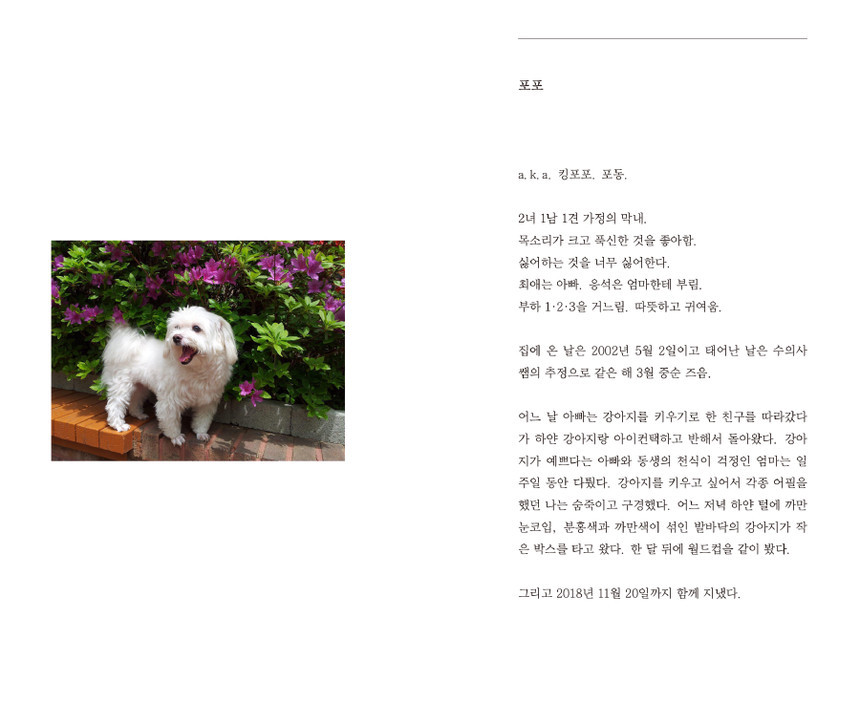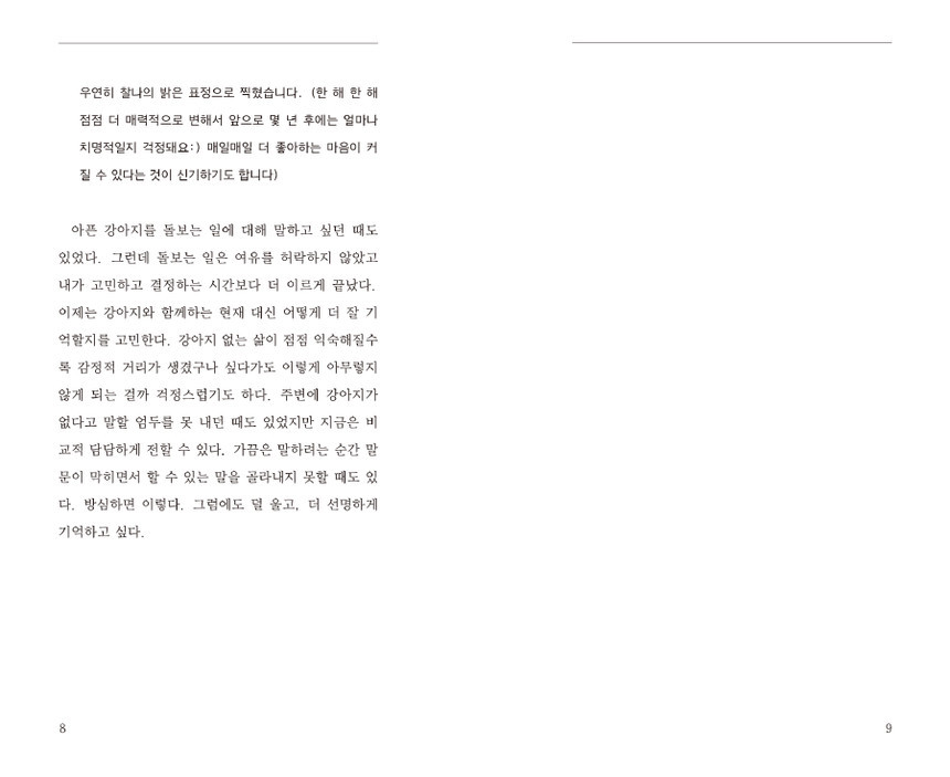 주변에 강아지가 없다고 말 할 엄두를 못 내던 때도 있었지만 지금은 비교적 담담하게 전할 수 있다. 가끔은 말하려는 순간 말문이 막히면서 할 수 있는 말을 골라내지 못할 때도 있다. 방심하면 이렇다. 그럼에도 덜 울고, 더 선명하게 기억하고 싶다.