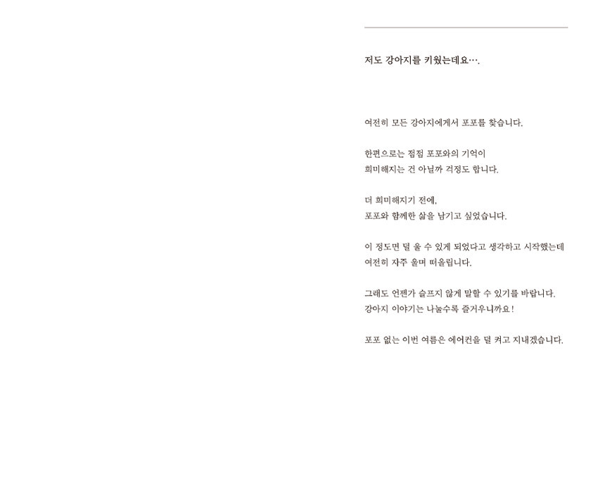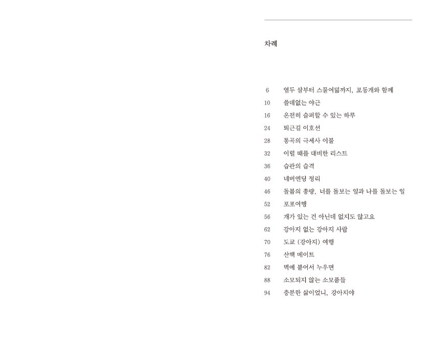 이 책은 슬프지만 슬픔이 전부가 아닌 ‘개가 있는 건 아닌데 없지도 않은’ 그 이후의 시간을 담 았습니다. 가족 모두가 그대로 있고 우리 집 막내 강아지만 없는 일상에 어떻게 익숙해 질 수 있을까요. 덤덤해지고 싶은 동시에 앞으로 기억이 흩어지는 일만 남았다고 생각하면 한없이 쓸쓸 해집니다. 시간이 흐르는 만큼 덜 울고 더 선명하게 기억하고 싶었습니다. 강아지와 나눈 소소한 일상의 순간들을 나누고 싶습니다.