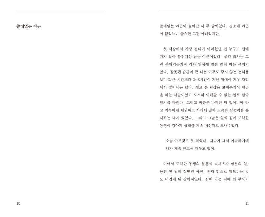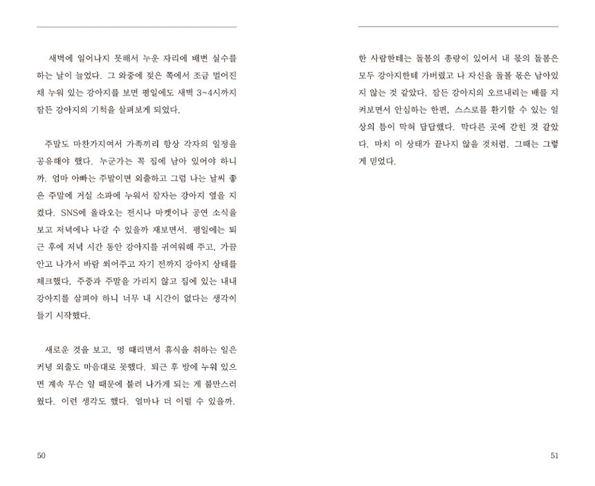 이런 생각도 했다. 얼마나 더 이럴 수 있을까. 한 사람한테는 돌봄의 총량이 있어서 내 몫의 돌 봄은 모두 강아지한테 가버렸고 나 자신을 돌볼 몫은 남아있지 않는 것 같았다. 잠든 강아지의 오르내리는 배를 지켜보면 서 안심하는 한편, 스스로를 환기할 수 있는 일상의 틈이 막혀 답답 했다. 막다른 곳에 갇힌 것 같았다. 마치 이 상태가 끝나지 않을 것처럼. 그때는 그렇게 믿었다. - 「돌봄의 총량, 너를 돌보는 일과 나를 돌보는 일」, p.51.