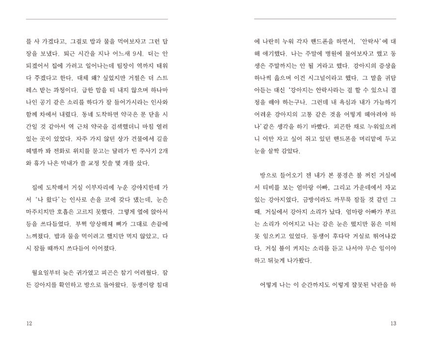 열두 살부터 스물여덟까지 함께한 강아지의 빈 자리를 생각합니다. 믿을 수 없는 속도로 약해지 는 강아지를 돌보면서 저는 끝이 보이지 않는다고 믿었습니다. 점점 작아지는 강아지를 언제까지 돌볼 수 있을까, 제게 남은 돌봄의 양을 저울질하며 때때로 인색한 마음을 가지기도 했습니다. 강아지를 돌보는 일에 이전과 비교할 수 없을 만큼 많은 시간과 노력을 쏟게 되었을 때, 갑자기 돌봄은 끝났습니다. 속수무책으로 약해지는 강아지를 곁에서 지켜보면서 답답하고 힘든 마음을 기댈 곳이 없는 게 아쉬웠습니다.