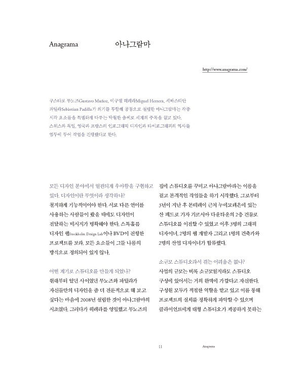 인쇄를 사랑하지 않을 디자이너는 아마도 없을 것이다. 좋은 제지와 특별한 마감이나 아름다운 제본 방식 등을 대체할 만한 디지털 요소는 아직까지 없는 듯하다. 디지털의 놀라움은 물론 말할 필요도 없을 만큼 대단하지만 조금만 더 생각해 본다면 인쇄라는 것은 사실 그 이상의 의미, 마치 디자이너가 사는 이유와도 같다는 사실을 깨달을 수 있을 것이다.