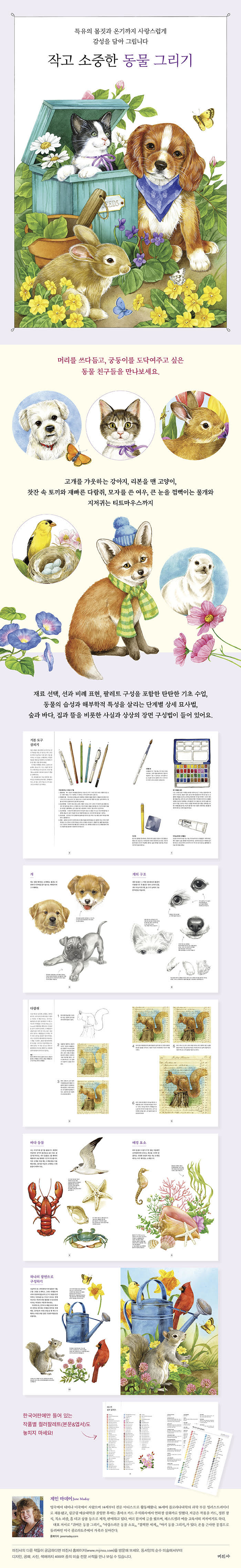 이 책에는 40여 년간 귀여운 동물 그림을 그려온 전문 일러스트레이터의 노하우가 한가득 담겨 있습니다. 고개를 갸웃하는 강아지, 리본을 맨 고양이, 찻잔 속 토끼와 재빠른 다람쥐, 모자를 쓴 여우, 큰 눈을 껌뻑이는 물개와 지저귀는 티트마우스까지, 머리를 쓰다듬고 궁둥이를 두드려주고 싶은 작고 소중한 동물들을 사랑스럽게 그리는 비법을 알려줍니다. 재료 선택, 선과 비례 표현, 팔레트 구성을 포함한 탄탄한 기초 수업, 동물의 습성과 해부학적 특성을 살리는 단계별 상세 묘사법, 숲과 바다, 집과 뜰을 비롯한 사실과 상상의 장면 구성법을 수록했습니다. 강아지.고양이.토끼 같은 반려 동물, 양.당 나귀.돼지 같은 농장 동물, 사슴.다람쥐.스컹크.수달.여우.늑대.곰 등 숲속 동물, 돌고래.물개 같은 바다 동물, 오리.홍학을 비롯한 새와 곤충, 그리고 자연 물 등의 단계별 그리기 방법 35가지를 만나보세요. 한국어판에만 있는 <작품별 컬러팔레트>를 엽서로도 동봉해서 그릴 때 손쉽게 참고할 수 있게 했습 니다.
