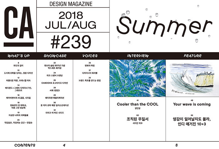 디자인 매거진 CA #239(2018년 7-8월호) 커버 스토리는 ‘여름과 디자인’입니다. 이번 기획 기사 ‘Your wave is coming’에서는 태양과 파도가 만드는 예술인 서프 디자인을 다루었습니다. 파도와 모니터를 자유롭게 넘나드는 영혼들을 만나보세요. ‘영감이 일어날지도 몰라 인디 매거진 10+3’에서는 다양한 소재를 다루는 독립 잡지를 소개합니다. 해외 10선과 국내 3선의 인디 매거진이 여러분에게 새로운 시야를 선사할 것입니다.