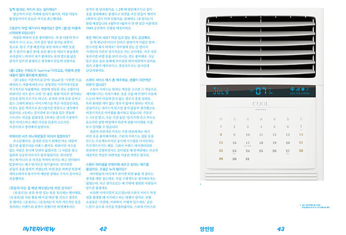첫 주인공은 디자이너 맛깔손입니다. 인터뷰 섹션에는 디자인 매거진 CA의 디자인을 맡게 된 양민영 디자이너와 이야기를 나누어 보았습니다. 그가 지금까지 진행해 온 작품들과 앞으로 CA에서 펼칠 정체성을 들여다봅니다. 또한, ADHD를 앓아온 일러스트레이터 사이만 차우의 직관적인 애니메이션 작품 소개와 인터뷰가 있습니다. 그가 병을 작업에 어떻게 이용했는지 솔직한 이야기를 들어볼 수 있습니다.