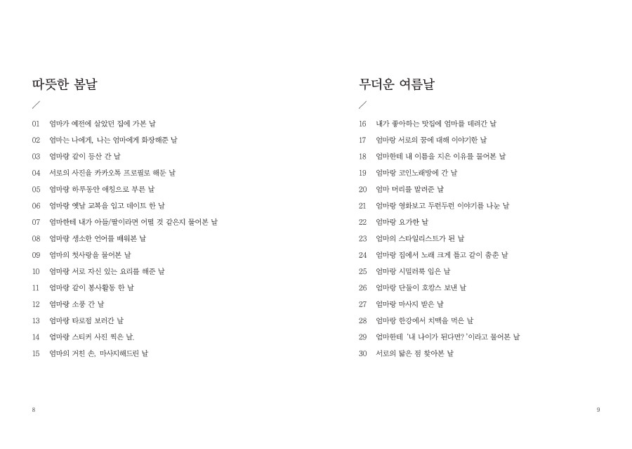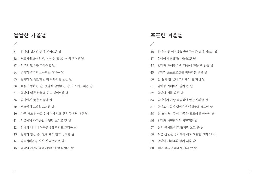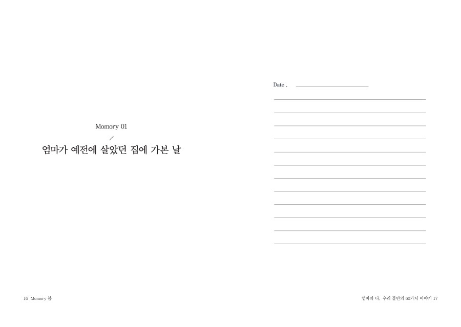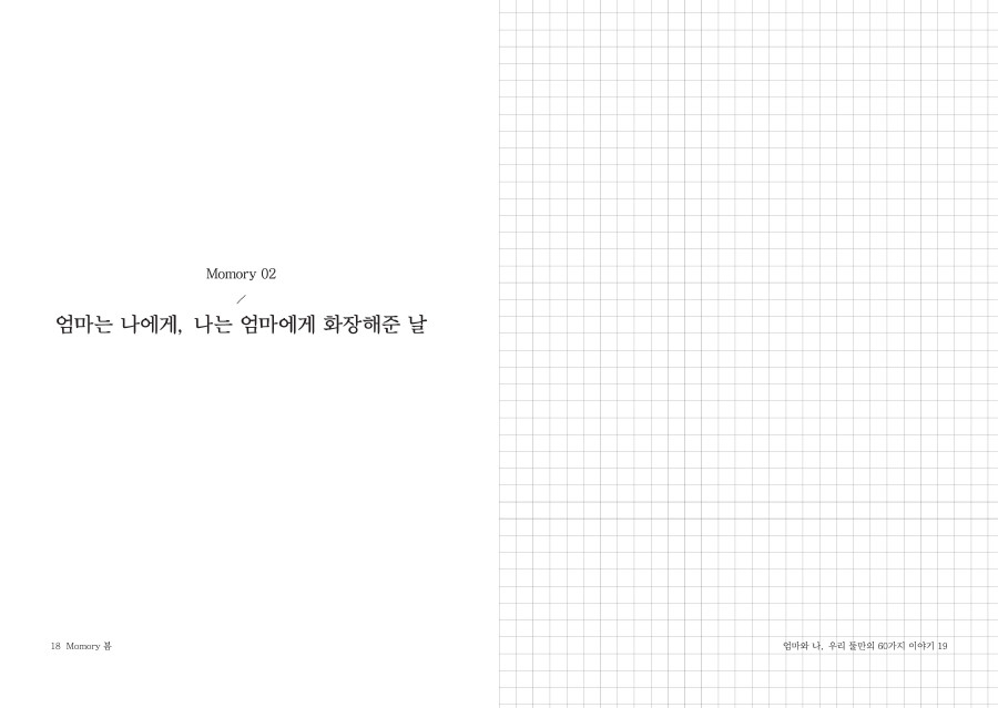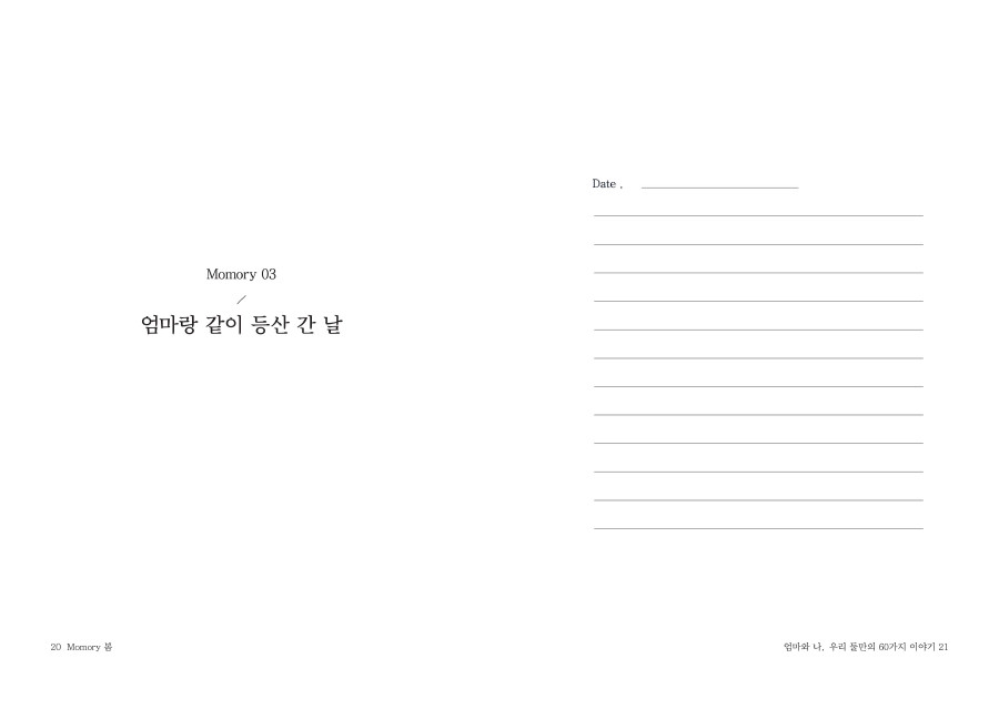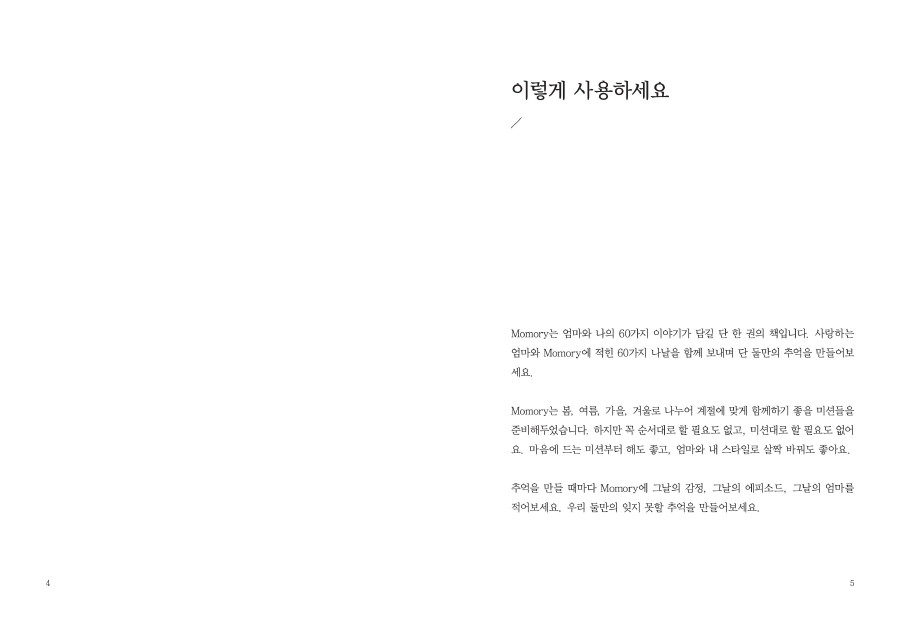 MOMORY에는 엄마와 함께하면 좋은 60가지 날들이 담겨있습니다. 서로 다른 나이를 살아도, 서로 다른 취향이어도 엄마와 함께하면 즐거운 미션들로 구성했어요. '서로 애칭 부르기', '엄마에게 엉뚱한 질문하기'처럼 소소한 미션도 있고, '콘서트 가기', '10년 후 서로에게 편지쓰기' 같은 특별한 미션도 있어요. 봄, 여름, 가을, 겨울 계절에 맞게 하나씩 미션을 이뤄가며 엄마와 나, 둘만의 추억을 만들어보세요.