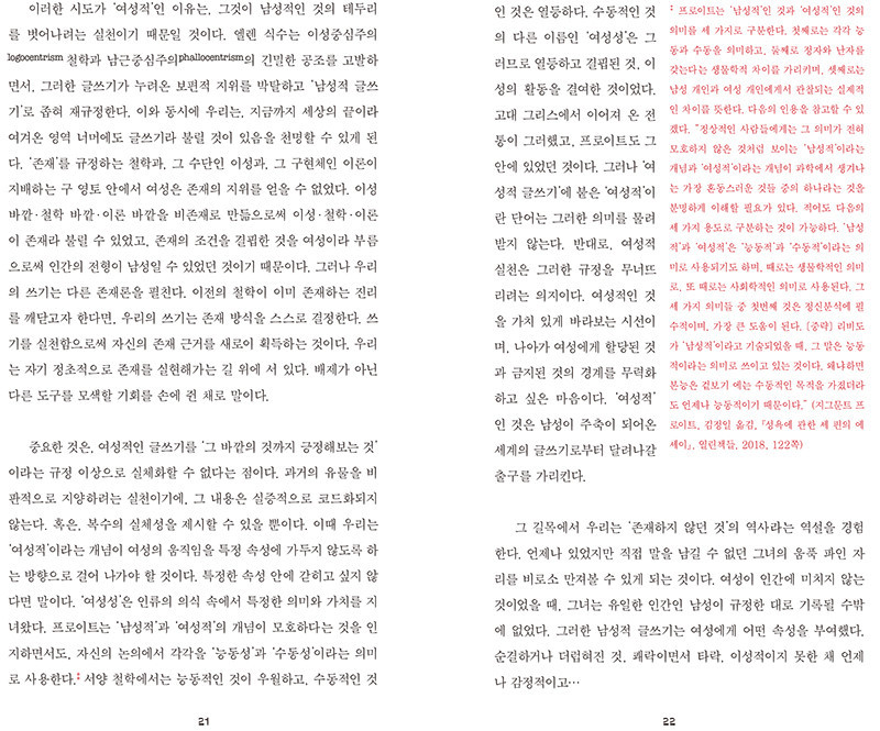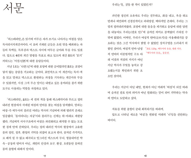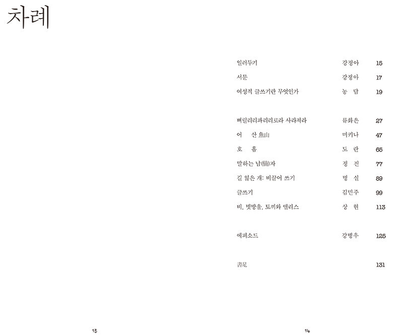 2. 계간 2호는 순차적으로 읽든 선택적으로 읽든 그리 중요하지 않습 니다. <여성적 글쓰기란 무엇인가> 질문의 단계를 밟아 가면서도, <에피소드> 응답에 반문을 가져보길 권장합니다.