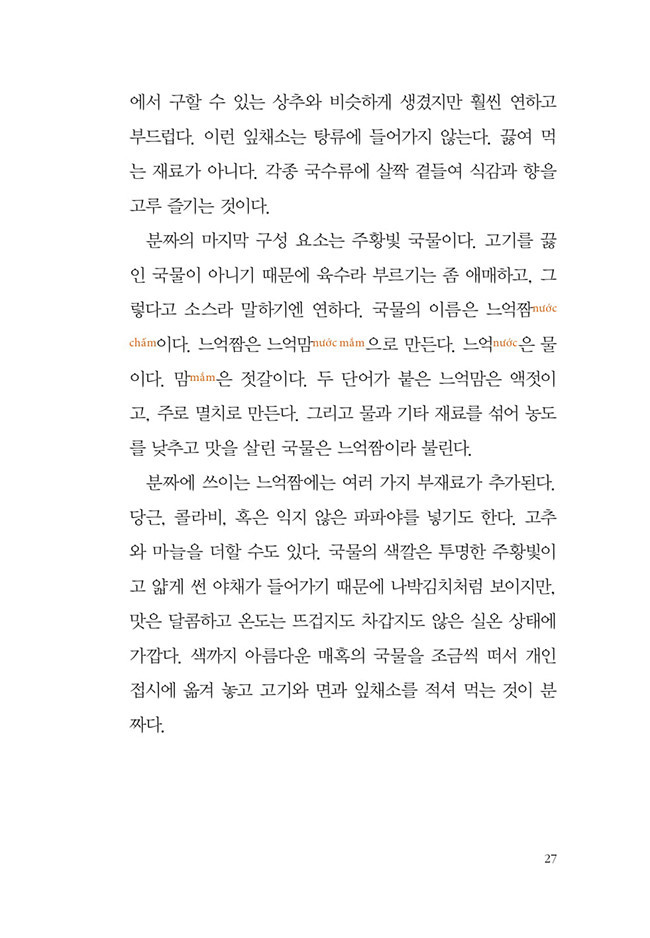 전 세계 음식을 소개하는 ‘한 접시 시리즈’의 두 번째 책이다. 서울 구로지역 이주여성 단체 미래길의 대표 응우옌김빈이 들려준 베트남 음식 이야기를 이민희가 정리했다. 베트남 친구의 삶이 녹아 있는 음식을 보다 깊게 이해하고자 베트남으로 한 달간 여행을 떠나 쓴 책이기도 하다. 고기 가득 붉은 국수 분보훼, 노릇한 부침개 반세오, 달콤한 디저트 체까지 분짜와 퍼 너머의 다양한 음식이 펼쳐진다.