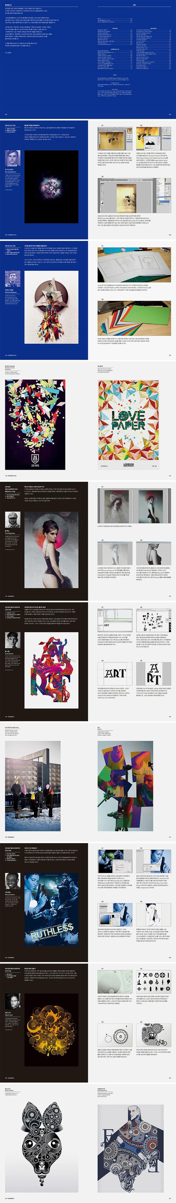 뿐만 아니라 이 책은 또 다른 큰 장점을 갖고 있습니다. 47 가지 테마들에 대한 작업과정을 소개하면서 이를 응용하여 활용할 수 있도록 풍성한 예제 작업물들을 함께 담았다는 것입니다. 이는디자이너의 상상력을 자극하고, 새로운 아이디어와 영감을 불어 넣어줄 것입니다.
