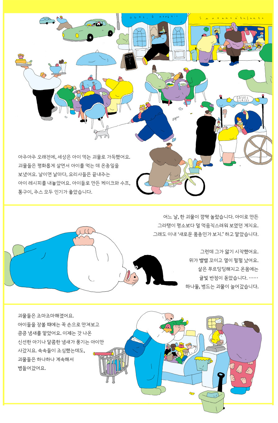 현대인의 식문화를 빗댄 듯한 일면 끔찍한 서사를 로이크 프루아사르는 가느다란 펜선으로 펑키하고 위트 있게 보여줍니다. 저희 편집부도 사실은, 제목과 그림체만 보고 첫눈에 그림책을 집어들게 되기도 했는데요. 얼굴은 조막만 한데 구름처럼 두둥실 떠다니는 듯한 한 덩치 하는 괴물들과, 아직 뜯어먹히기 전의 순진한 아이들 표정을 아슬아슬하게 담은 그림체가 퍽 모던하고 중성적입니다. 모든 그림책의 펼침면은 두 페이지로 연결된 큼직한 그림 한 장을 오롯이 담고 있어, 마치 포스터나 화보를 바라볼 때의 호쾌한 인상도 받게 됩니다.