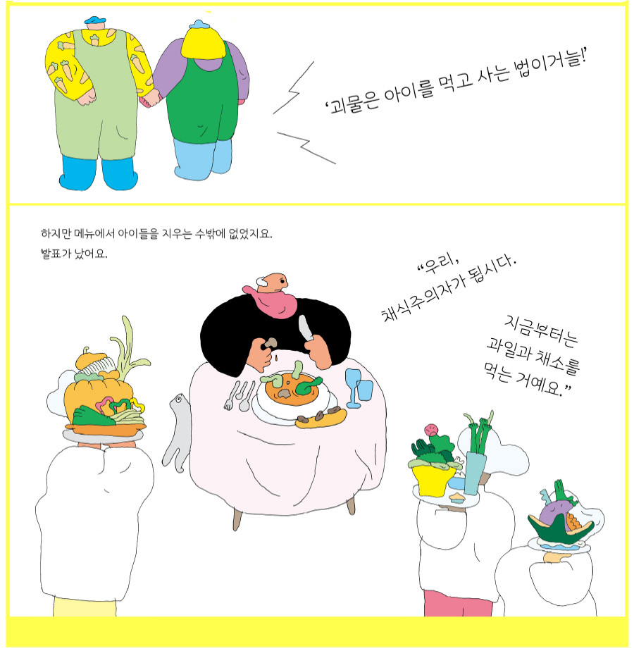 먹거리가 단지 행동의 연료에 머무는 단순한 시절은 오래전에 지난 것 같습니다. 우리가 무엇을 먹고 무엇을 먹지 않기로 했는지, 무엇을 포기하고 무엇을 수호하기로 결심했는지에 따라 금세 달라지는 주변의 풍경을 목도하게 되니까요. 더 이상 아이를 먹지 않게 된 괴물들이 어쩌다 옛 추억에 잠길 때도 있습니다. 예전에 아이들로 했던 것처럼 곡식과 채소를 차려놓고 천천히 음미해보기도 하고요. 하지만 이제 먹지 않게 된 아이는 자랍니다. 괴물만큼이나 크고 건강하게 자랍니다. 우스개소릴 잘하고, 먹고 마시고 요리하기를 즐기는, 괴물과 꼭 같은 생명체들로... 여러분은 오늘 무엇을 드셨나요? 내일은 무엇을 드시지 않을 작정인가요? 그리고 무언가를 꼭꼭 씹어먹고 있는 우리들 안에서, 괴물을 발견하지는 않았나요? 그렇다면 메뉴판에서 고기를 지워내고 나서야, 비로소 먹거리의 새로운 균형을 찾은 괴물들의 이야기에 귀 기울여 보세요.