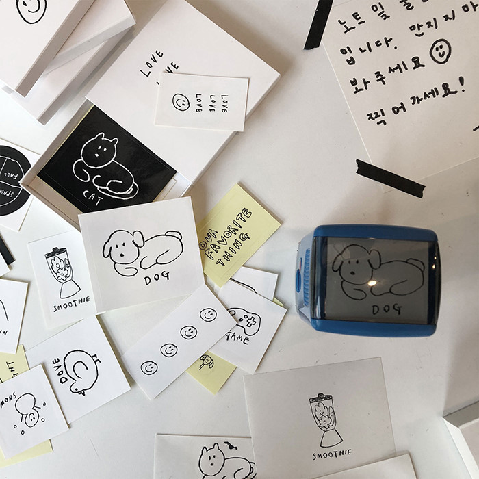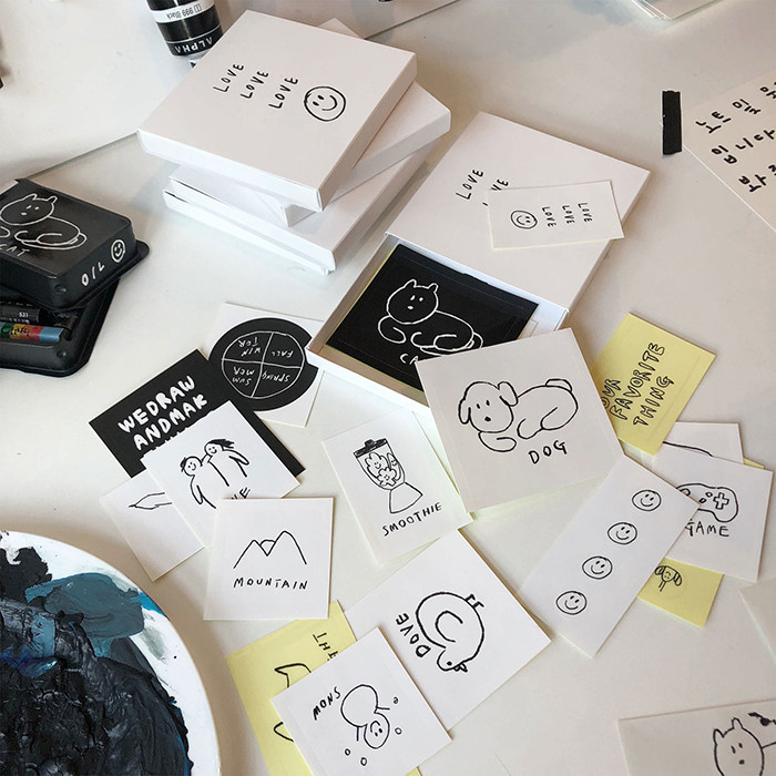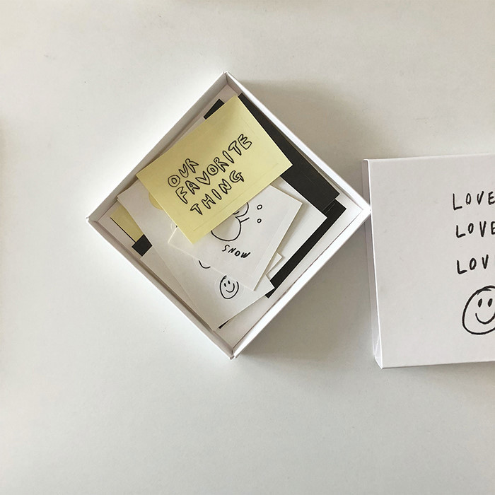 우리가 좋아하는 단어인 LOVE가 돋보이는 상자케이스안에 우리가 좋아하는 그림, 단어들이 우리만의 스타일로 재해석 되어 있습니다. 스티커는 그 어떤 매체보다 가벼울 수 있지만 어떤 물건에 부착하느냐에 따라 충분히 무거워질 수도 있고, 또 의미 있어지거나 훨씬 값져질 수 있다고 생각합니다.