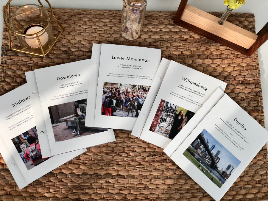 각 지역 분위기에 맞는 아이템을 이용한 탑뷰 사진, 그리고 뉴욕 여행에서 필요한 몇 가지 팁이 포함되어있습니다.