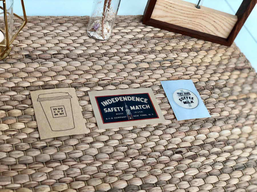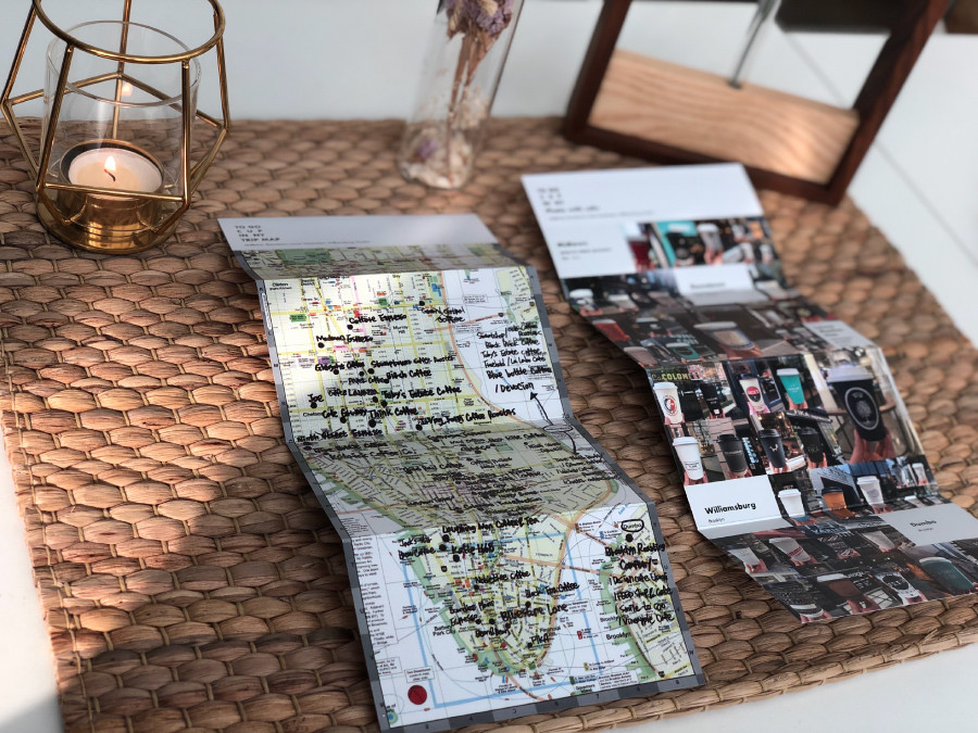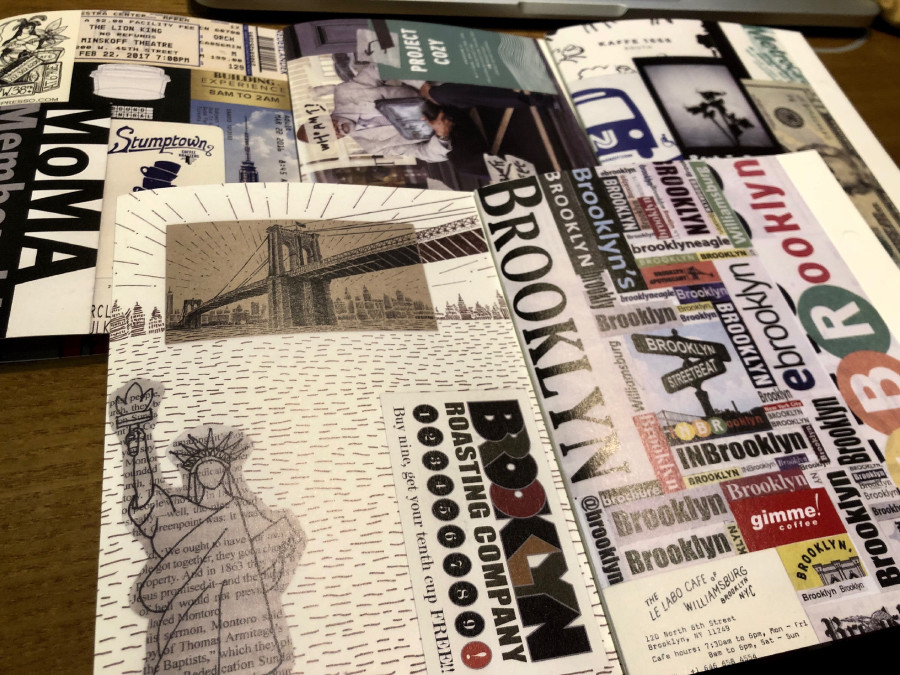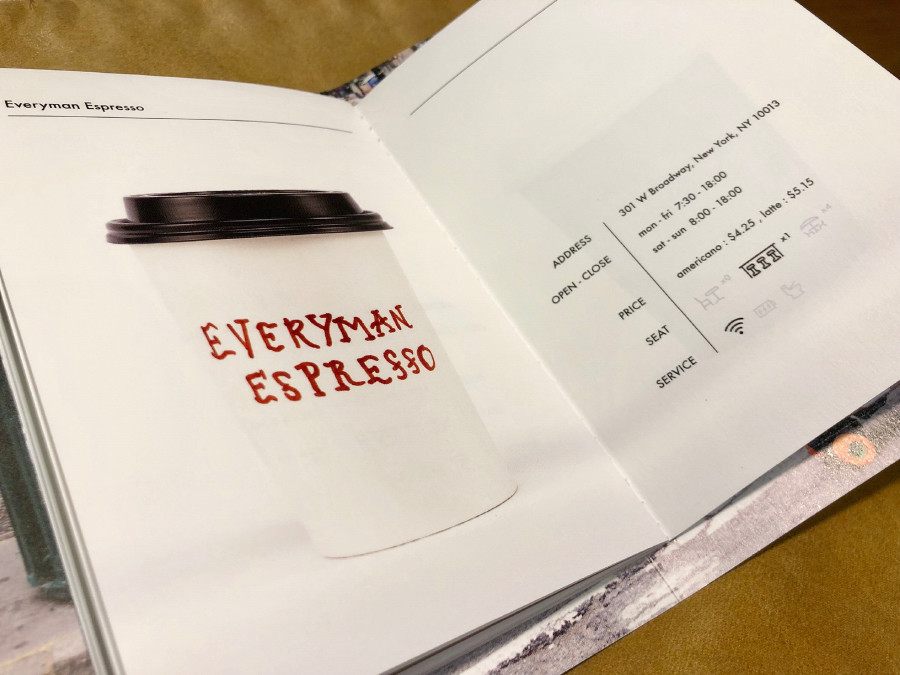 책에는 카페 소개뿐 아니라 뉴욕의 일상 사진과 카페 명함 등을 활용하여 만든 콜라주,