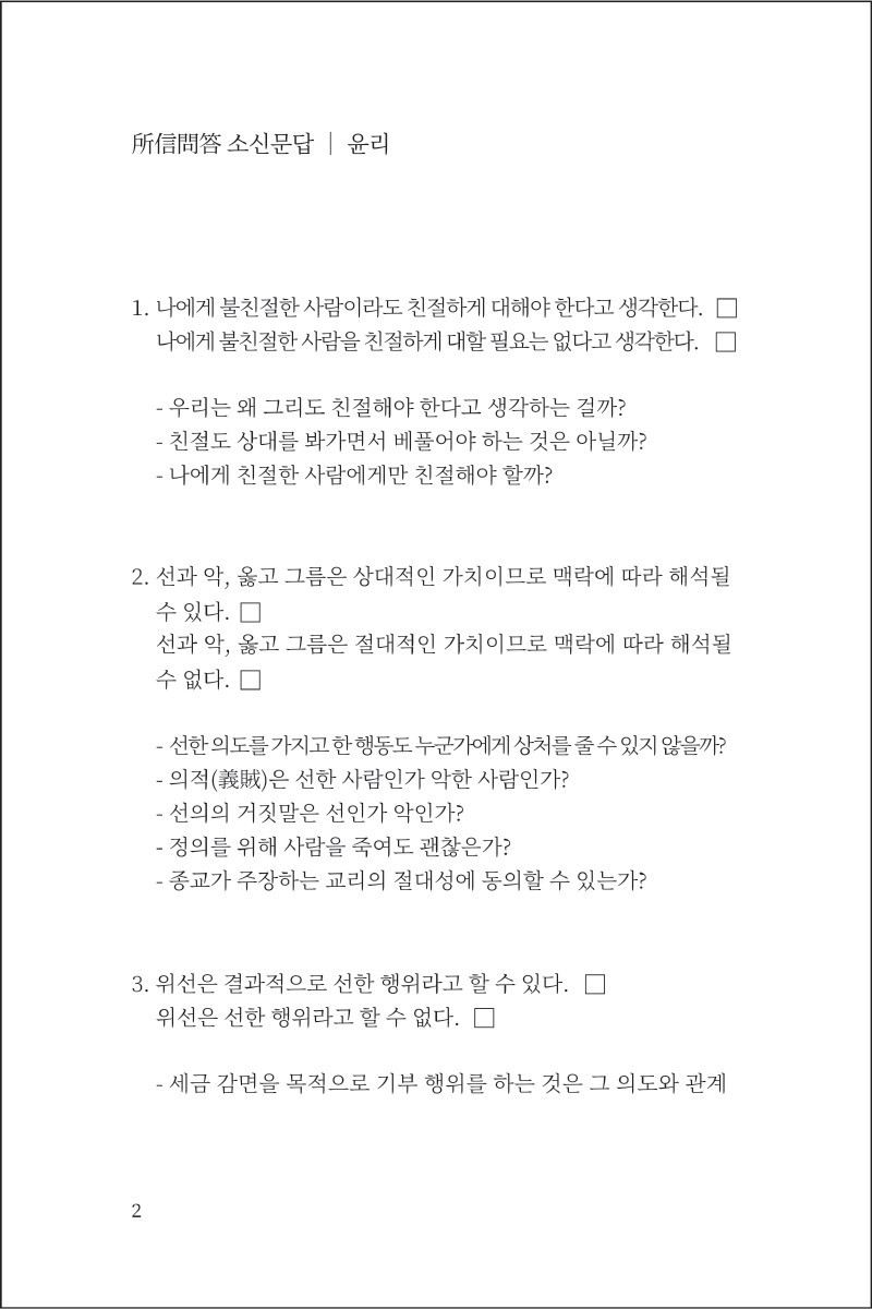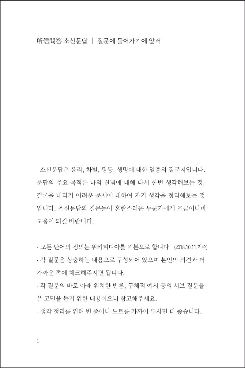 소신문답은 개인의 가치관과 지향에 대한 일종의 질문집 입니다.