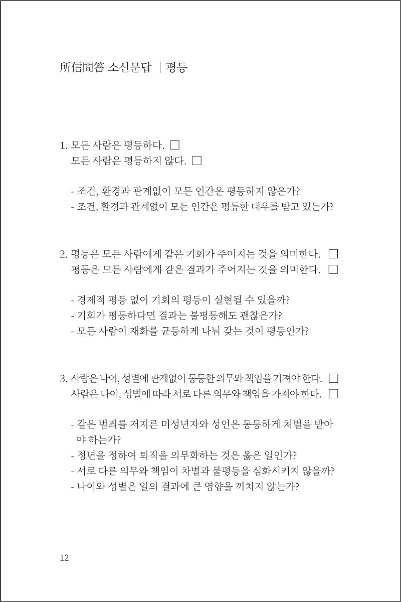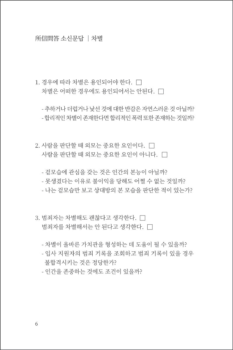 각 질문은 사고의 편의를 위하여 윤리, 차별, 평등, 생명이라는 키워드로 묶어두었습니다.
