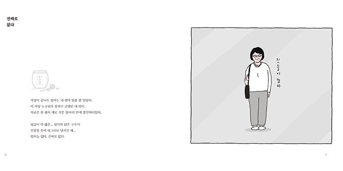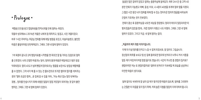 작가의 엄마는 백혈병 진단을 받고 항암 투병한지 6개월 만에 죽었다. 작가가 엄마를 잃은 고통을 극복하는 방식은 엄마에 대한 기억을 그리는 것이었다. 작가는 엄마의 부재 후 '심경변화' 와 과거 '엄마와의 추억'을 글과 그림으로 풀어놓았다.