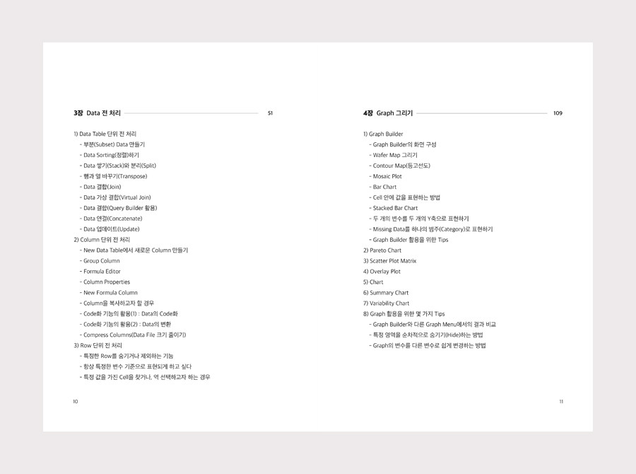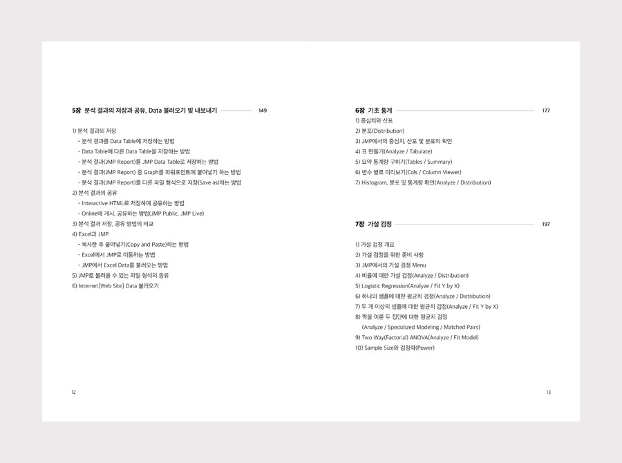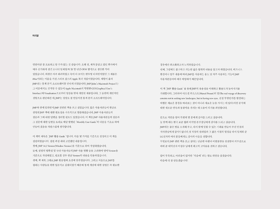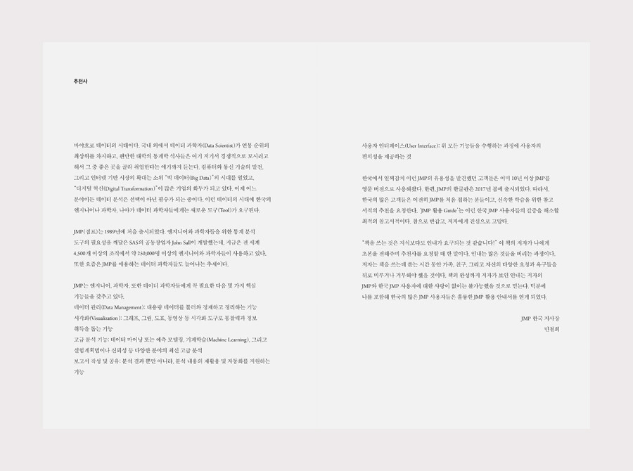 보다 많은 사람들이 JMP에 친근함을 느끼고 이를 통해 Data 분석에 대해 새로운 안목과 통찰력을 가지게 되기를 기대하며 이 책을 출간했다.