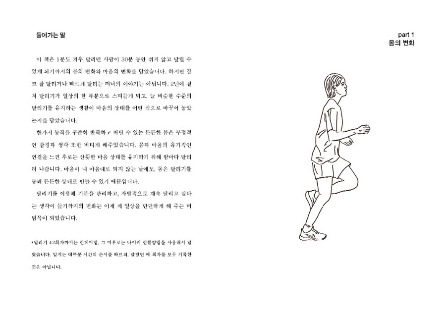 1분도 겨우 달리던 사람이 30분 동안 달릴 수 있게 되고, 현재 2년차 러너가 되기까지 몸과 마음의 변화를 담았습니다. 하지만 결코 잘 달리거나 빠르게 달리는 러너의 이야기는 아닙니다. 나만의 페이스로 조금씩 달리던 것이 2년에 걸쳐 일상의 한 부분으로 스며들게 되고, 규칙적인 달리기를 유지하는 생활이 '마음의 상태'를 어떻게 바꾸어 놓았는지를 이야기 합니다.