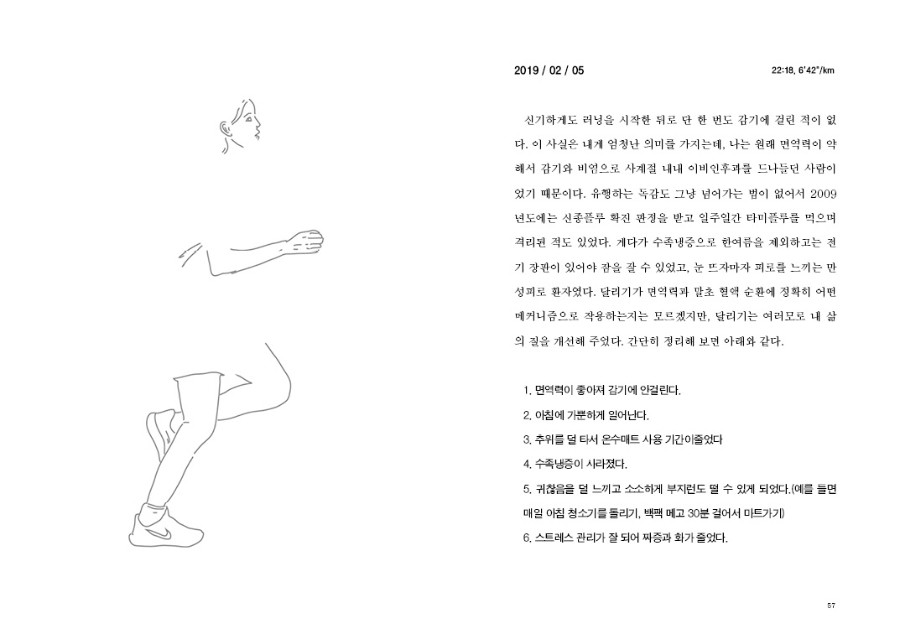 "늘 기분에 지배되던 몸이 새로운 사실을 깨달았다. 달리기를 통해 기분을 전환시킬 수 있으므로 기분은 조절 가능한 영역이라는 것을. 이런 경험이 반복되자 나는 중독된 것처럼 달리기를 멈출 수가 없었다." <p.33>