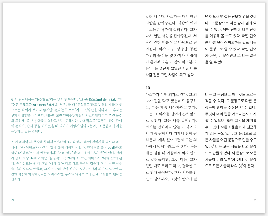 "날선 말"이란 말은 위선이다. 말은 원래가 치명적이기 때문이다. 제왕절개에 쓰이는 메스만큼이나 폭력적인 것. 이런 말이 전혀 은유적인 것이 아님을 이 극은 보여준다. 이 극의 제목은 "카스파"지만, 이 극의 주인공은 "언어"라고 해도 과언이 아니다. 여기서 문장들을 - 말하거나, 소리내어 - 읽는다는 것은 곧 이 언어를 작동하게 만든다는 것이며, 그러면서 이 언어의 행위를 읽는다는 것이다. (역자의 말)