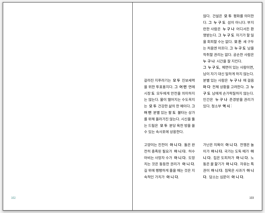 * 이 희곡은 사건의 동시적인 흐름을 일종의 '스코어'처럼 제시하고 있기 때문에, 때론 매우 복잡한 텍스트 박스들을 가지고 있습니다.