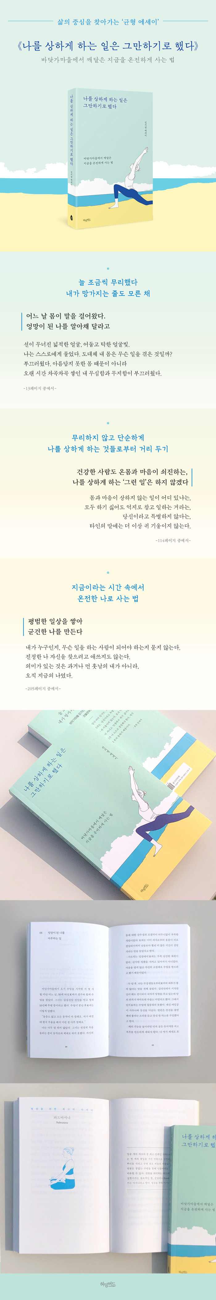 《나를 상하게 하는 일은 그만하기로 했다》는 몸도 마음도 삶도 망가진 저자가 모든 것을 내려놓고 바닷가마을로 가 요가를 가르치면서 무너진 자신을 회복해 나간 기록이다.