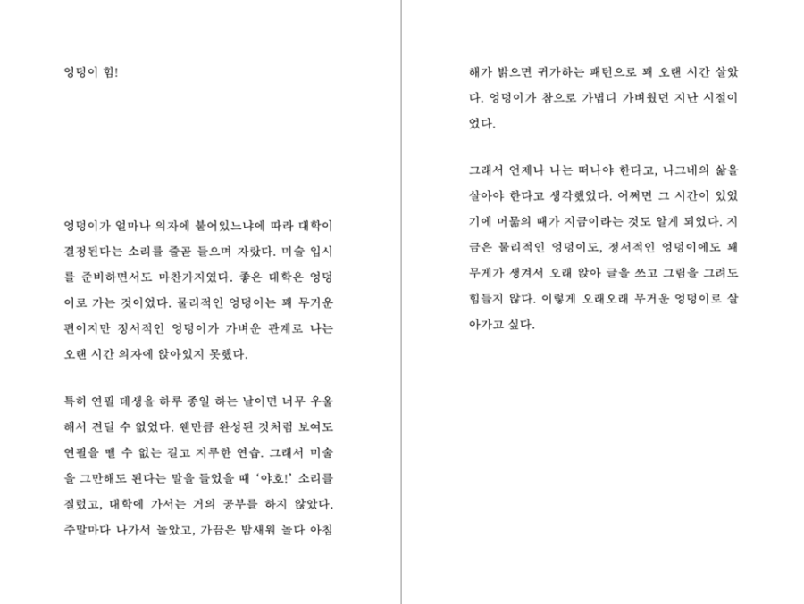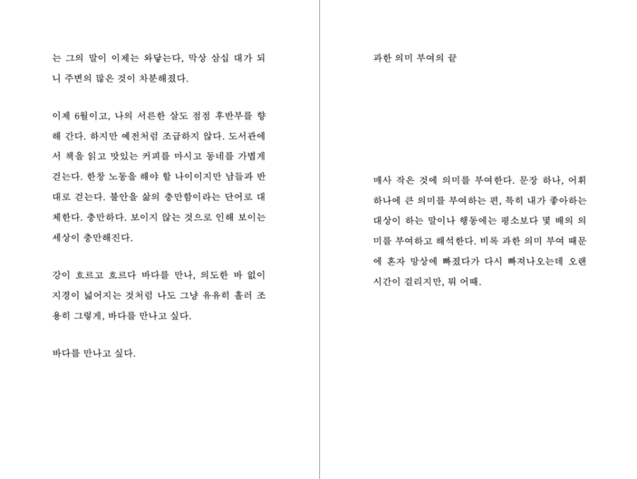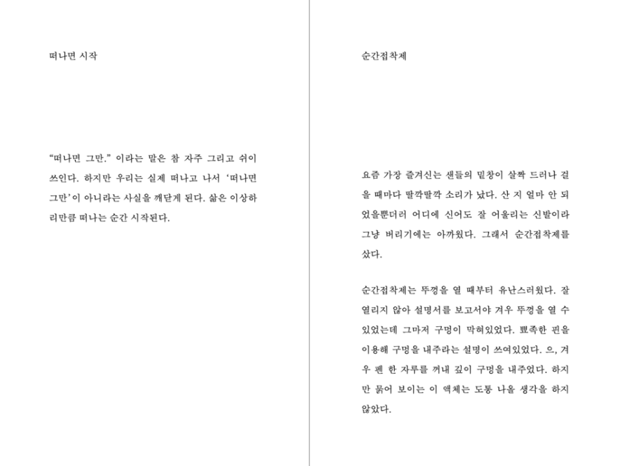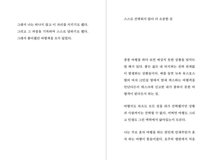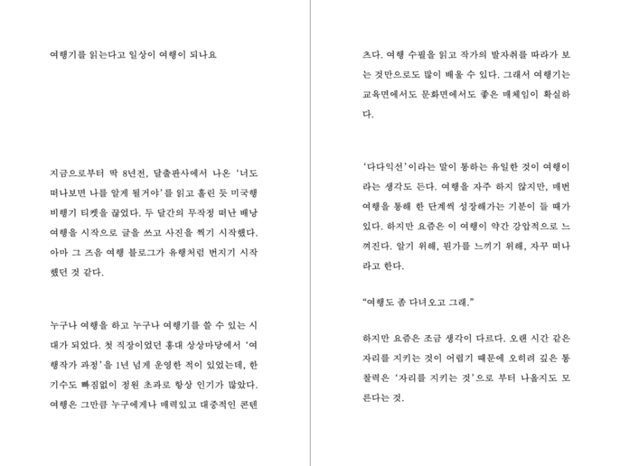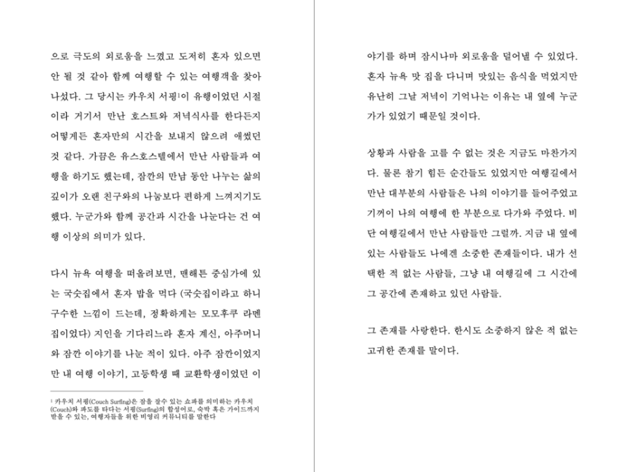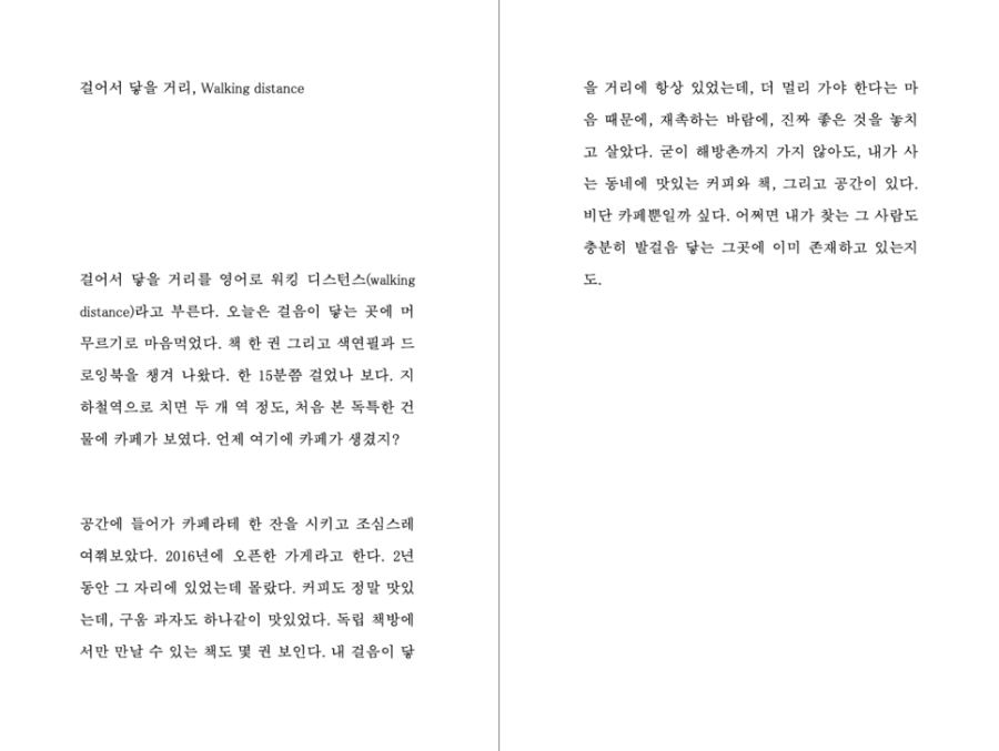 우연히 마케팅 트렌드에 관한 기사 하나를 읽었습니다. 거기에서는 '여행' 콘텐츠가 가장 영향력 있는 주제라고 말하고 있었습니다. 1년간 이 책을 집필하면서 저는 반대로 여행을 쉬었습니다. 모두가 떠나라고 말할 때 오히려 집에서 '걸어서 닿는 거리'에만 머물렀습니다. 교통비가 줄었고, 말수도 줄었고, 만나는 사람도 급격히 줄어들었지만, 묵묵히 내 자리를 지키는 것에 대해 매일 같이 생각할 수 있었습니다. 그리고 재미있는 건, 이 시간이 쌓여 일상이 여행이 되는 순간을 발견할 수 있었습니다. 내 주변의 아주 작은 것에 집중했을 때 얻어지는 것. 하물며 집 앞 편의점에서 파는 초콜릿 한 조각을 입에 넣는 순간도 여행이 될 수 있었습니다.
