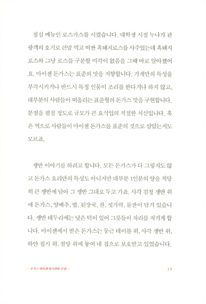 최고의 일러스트레이터 이나영과 함께한 이번 산문집은 제목에서 짐작을 할 수 있듯 ‘돈가스’에 관한 이야기를 주되게 담아내고 있습니다. 그러나 ‘돈가스’에 대해서만 말하는 책은 또 아닙니다. 직접 먹어보고 온 일본의 돈가스 가게 열 군데가 소개되고 있지만 특유의 감정적 호들갑으로 돈가스의 맛을 탐하게 하는 책도 아닙니다. 말하자면 이 책은 ‘돈가스’에 관해 자세히 말해보는 어떤 시도 속에 있다고나 할까요. 그런 ‘돈가스’를 향한 현재진행형의 책이랄까요. 어쩌면 저자 이로의 이 말이 긴요한 힌트가 될 것도 같습니다. “돈가스에 너무 집중한 나머지 어떤 말은 돈가스와 아무런 관련이 없을 터입니다. 돈가스와 상관없는 생각마저 돈가스가 불러오죠.” 그러니까 열 곳의 일본 돈가스 가게에서 먹고 듣고 우물거리며 생각한 표현들이요, 그걸 공유하고자 하는 마음이요, 그 진심에 대한 전심이 바로 이 책이 아닐까 합니다.