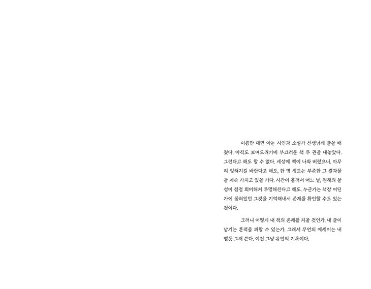 혹독하고 마음이 어는 겨울과 날카롭게 찌르는 여름을 지나가며 써내려간 유언의 기록은 언젠가는 나의 치부가 될지 모릅니다.