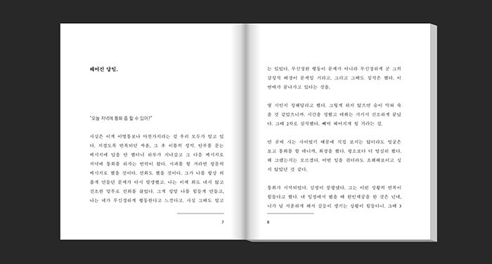절대로 나아지지 않을 것 같았던 날들을 가까이에서 지켜볼 수 있습니다. 어제는 괜찮은 것 같다가도 갑자기 눈앞이 캄캄해지는 오늘, 그러다가 또 괜찮아지는 내일이 뒤섞여있습니다. 나는 매일이 같았다고 생각했지만, 한 장 한 장 읽어내려가면 분명히 달랐던 매일이 숨어있습니다. 너무 걱정 안 하셔도 돼요, 이별 후의 삶이 실제로 그렇듯이 생각보다 매일 우울하기만 하지는 않습니다. 탈고 시점은 이별의 여파에서 탈출한 다음으로 했습니다. 나름대로 해피엔딩입니다. (주관주의)