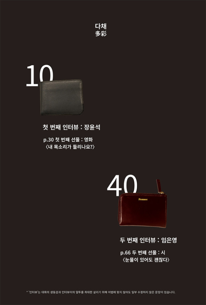 말 걸고 싶을 정도로 궁금하진 않았지만, 그렇다고 관심이 없지도 않았던 사람들에게 대신 물어봐 드리겠습니다. 당신의 지갑엔 뭐가 들었는지, 당신은 어떤 고민을 하고 있는지, 당신은 어떻게 남들과 다른지.
