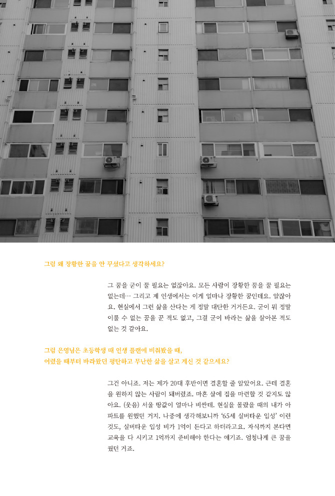 회색빛 사회에 살고있는 것 같다는 생각이 들었습니다. 각자가 크고 작은 다른 점들을 지니고 있는데 드러내지 않고, 드러낼 기회도 없죠. 누구나 주인공이 되어 자신을 드러낼 수 있는 기회를 만들고 싶었습니다. 유명한 사람이나 한 가지 눈에 띄는 주제에 관한 인터뷰 말고, '진짜 평범한' 이야기가 듣고 싶었습니다. 평범하기 때문에 연대할 수 있는, 평범하지만 사실은 각기 다른, 그런 이야기들.
