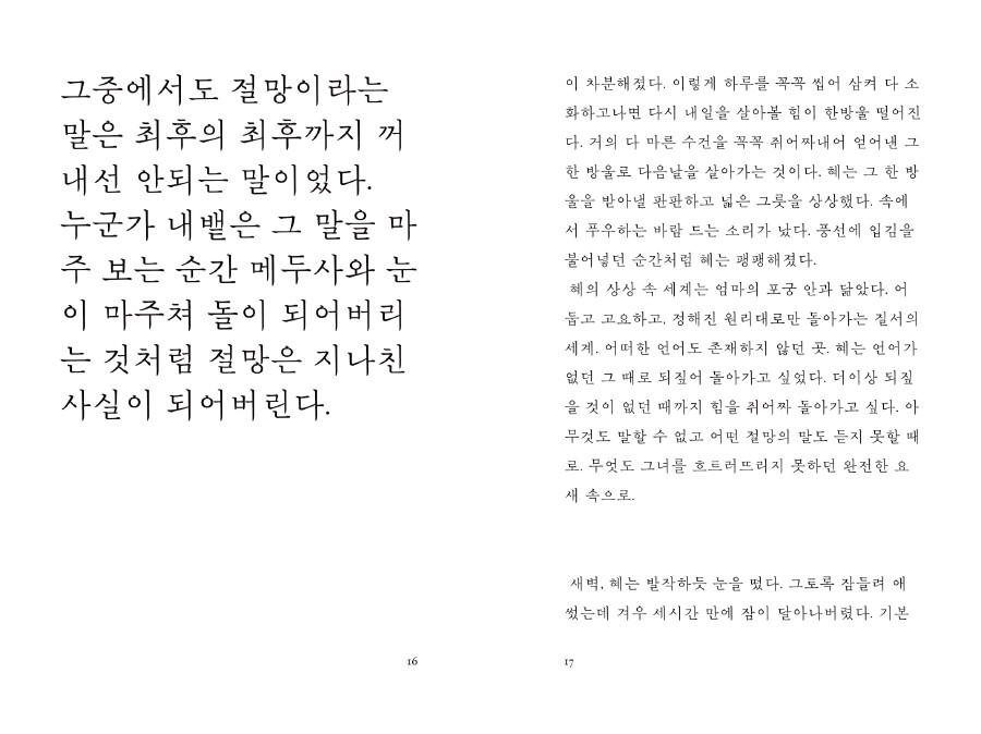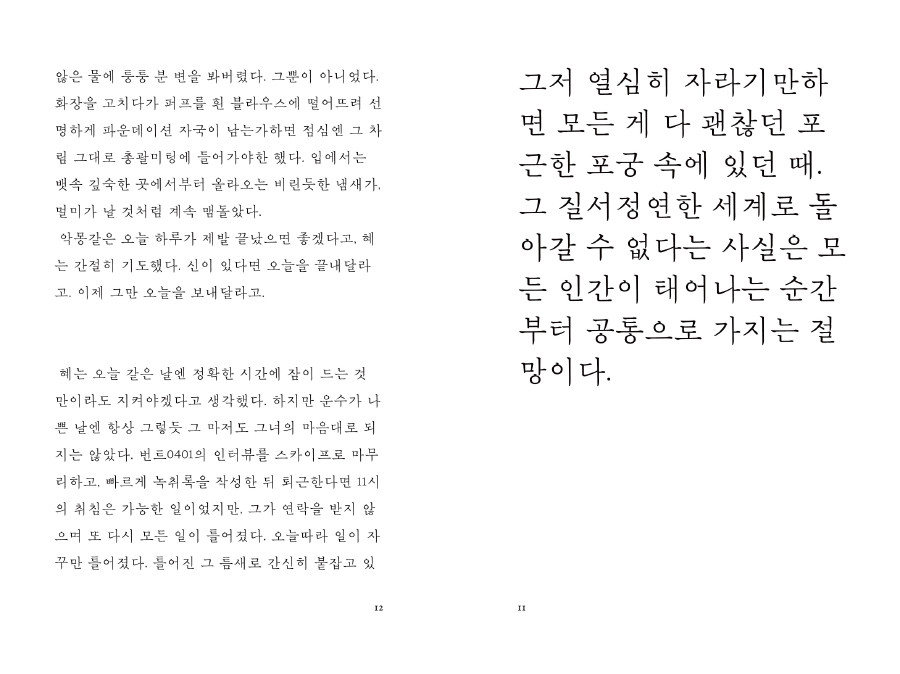 "그저 열심히 자라기만하면 모든 게 다 괜찮던 포근한 아기집 속에 있던 때. 그 질서정연한 세계로 돌아갈 수 없다는 사실은 모든 인간이 태어나는 순간부터 공통으로 가지는 절망이다. "