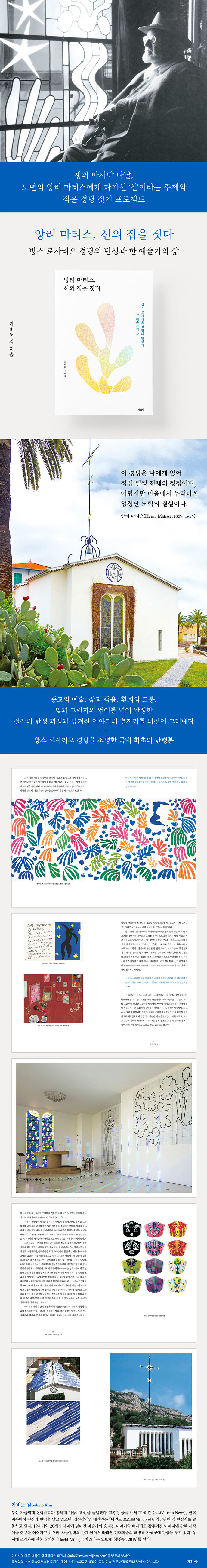 방스 로사리오 경당을 다룬 국내 최초의 단행본인 『앙리 마티스, 신의 집을 짓다』를 통해, 독자들은 경당의 축조 과정을 자세히 들여다볼 뿐 아니라 모더니즘 시대 미술가의 고민과 과제에 공감하며 마티스 예술의 지도를 그려낼 수 있을 것이다.