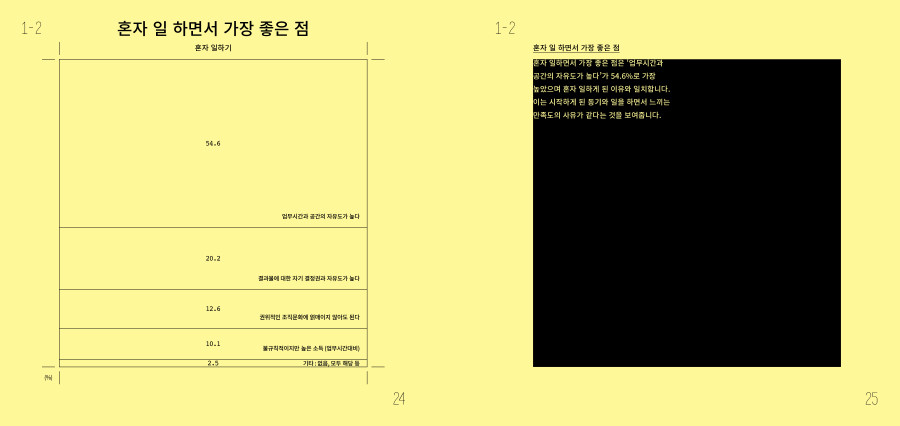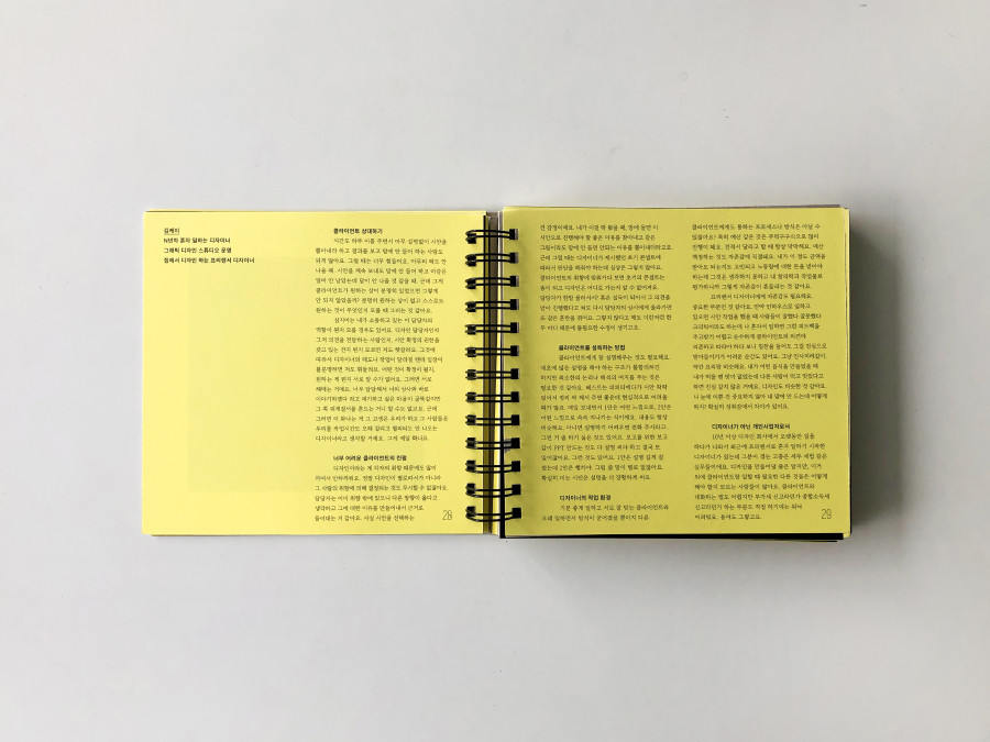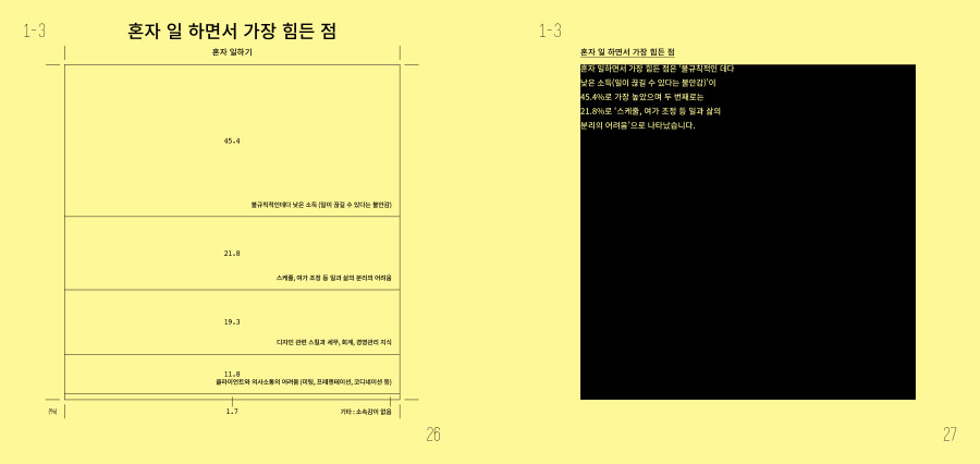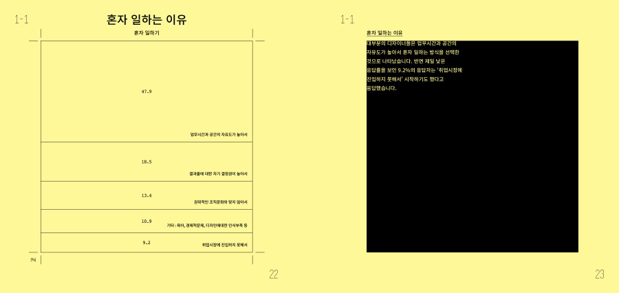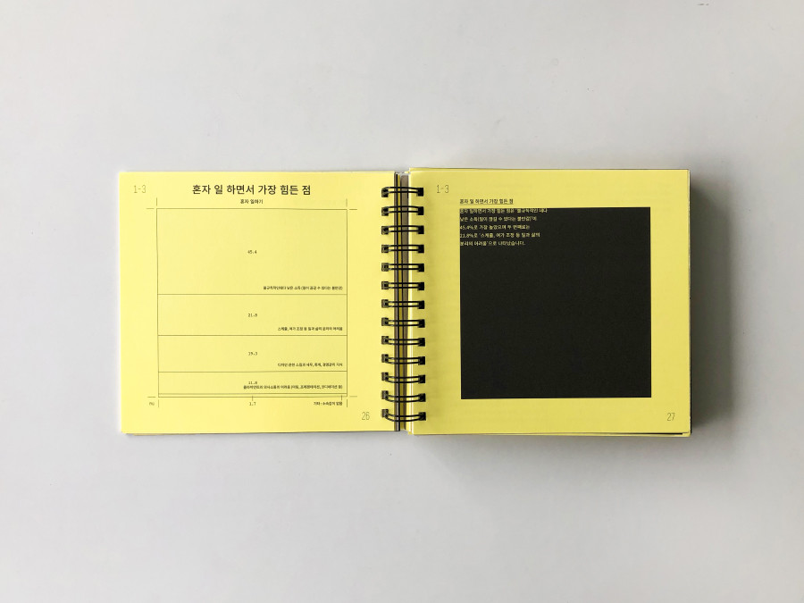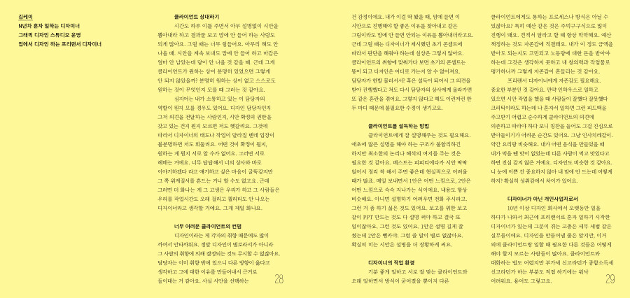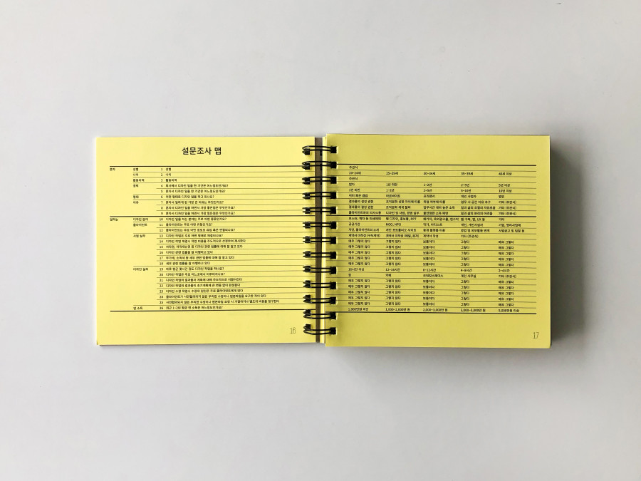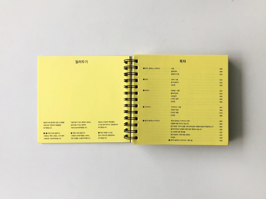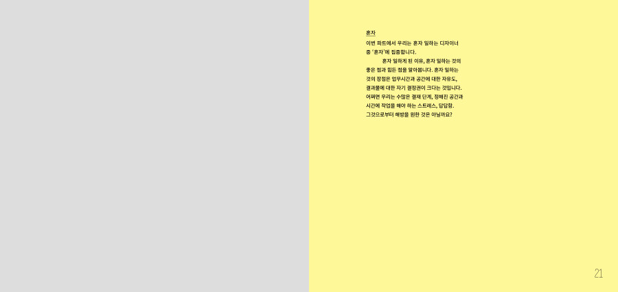 왜 혼자 일하는지, 어디서 일하고 얼마나 벌고 있는지, 클라이언트 유형에 따라 업무환경이 달라지는지 등 혼자 일하는 디자이너라면 한번쯤 궁금했던 질문과 결과를 모아 출판물 형태로 제공합니다.