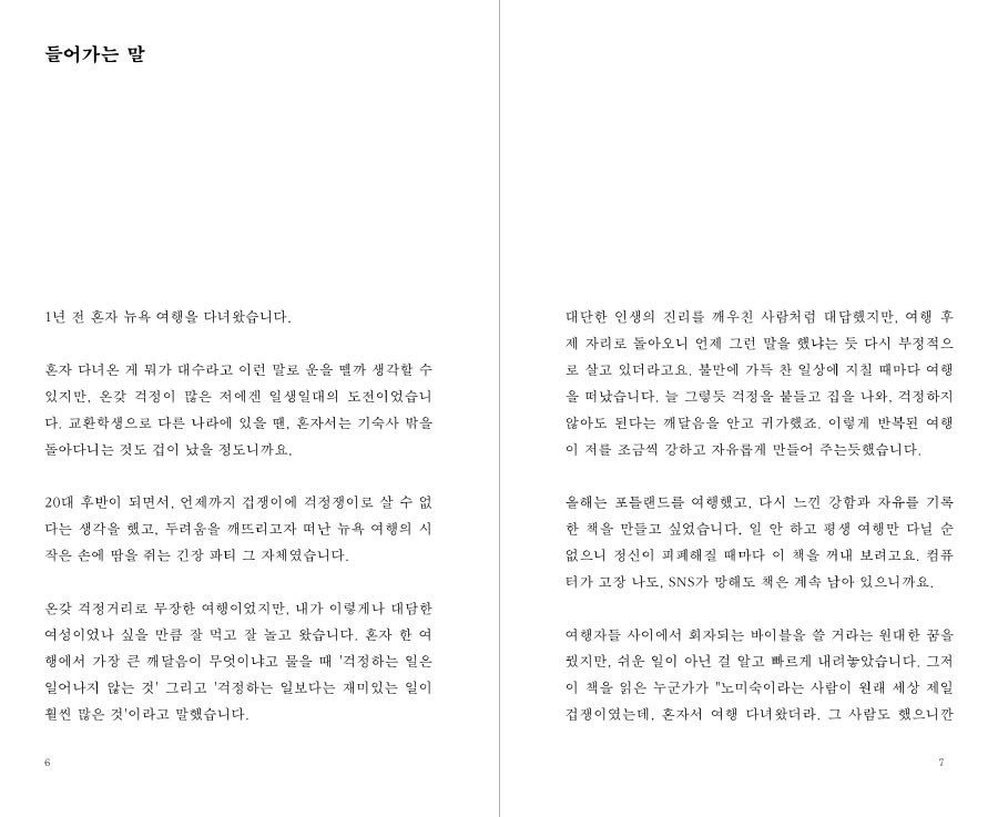 겁 많은 제가 혼자 여행하며 마주친 걱정, 장소와 사람, 생각의 전환에 대한 이야기 입니다.