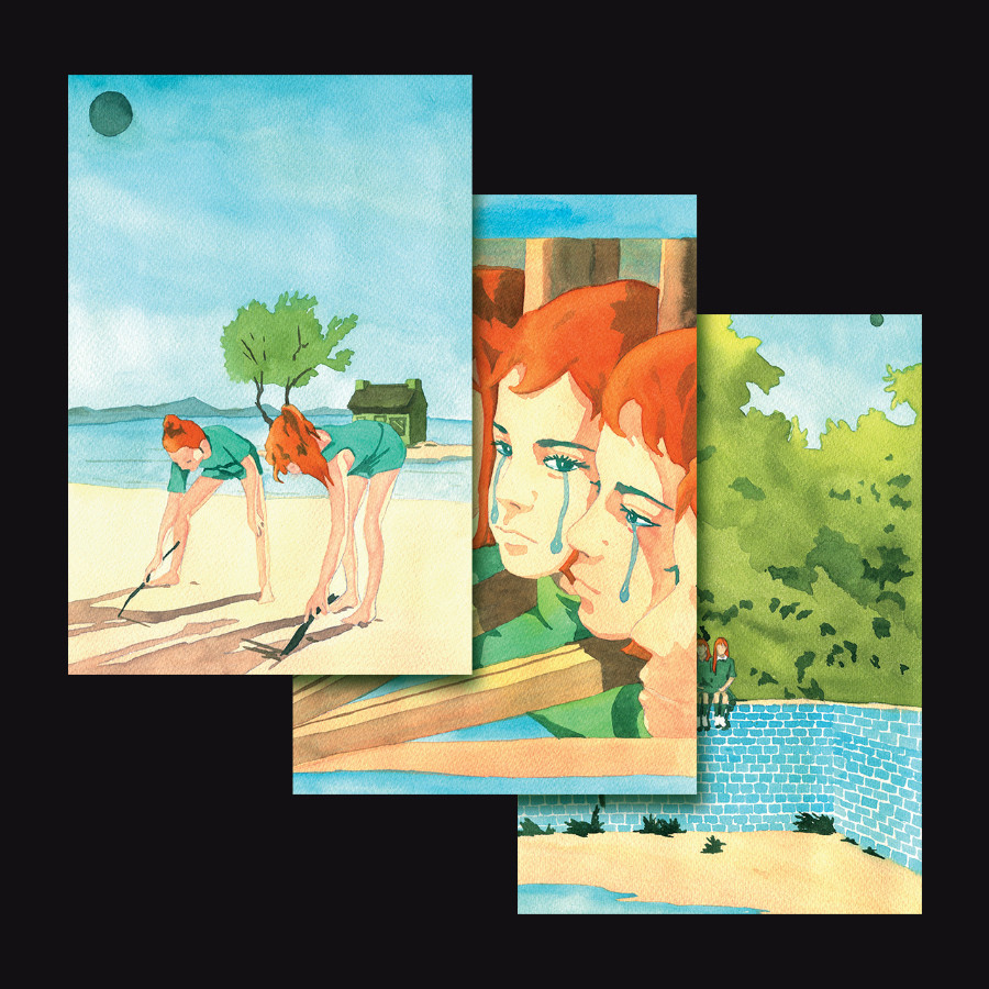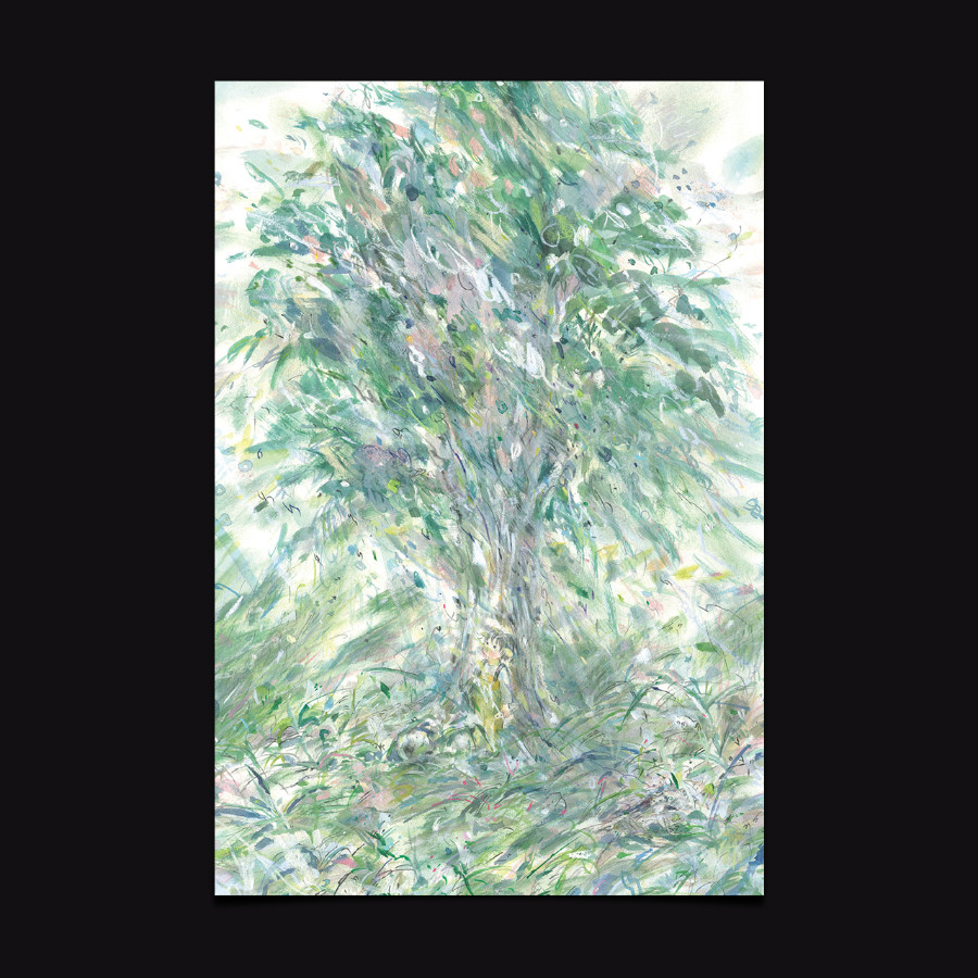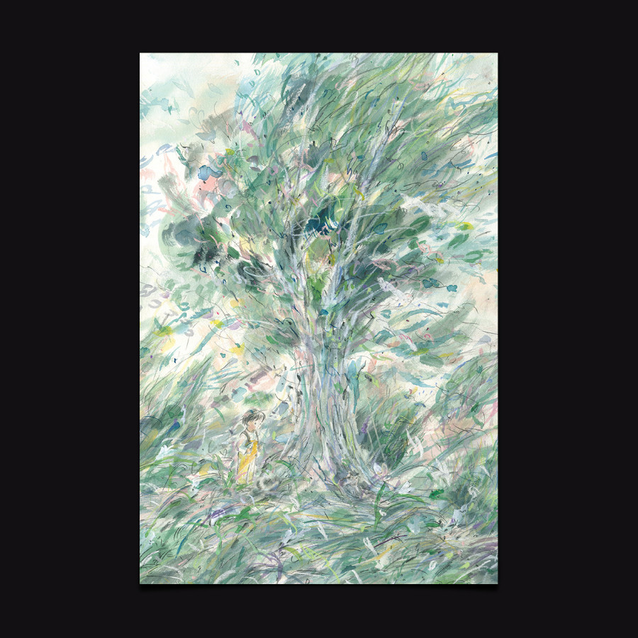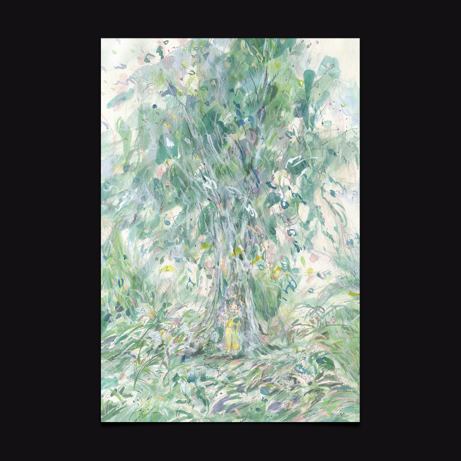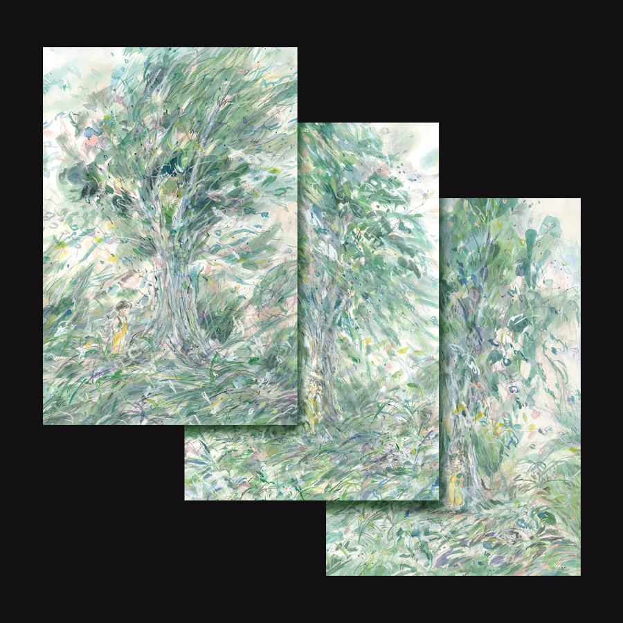 휘리의 「We all see something in different」는 한 나무의 주위를 맴도는 아이를 그립니다. 오카리나를 들고 있는 아이지요. 비슷해보이는 그림들이지만 가만 보면 바람의 방향이 다르고, 고양이와 사람이 조금씩 자리를 옮기면서 고유한 이야기가 만들어집니다.