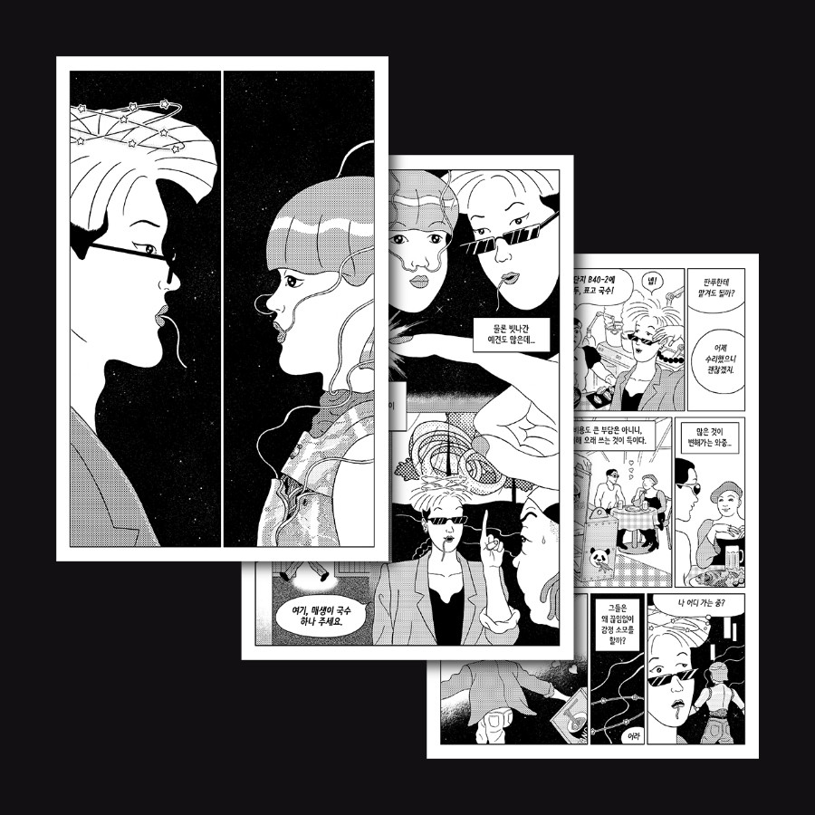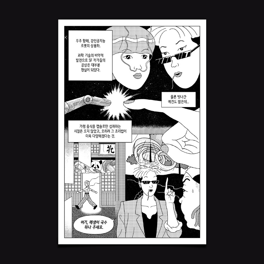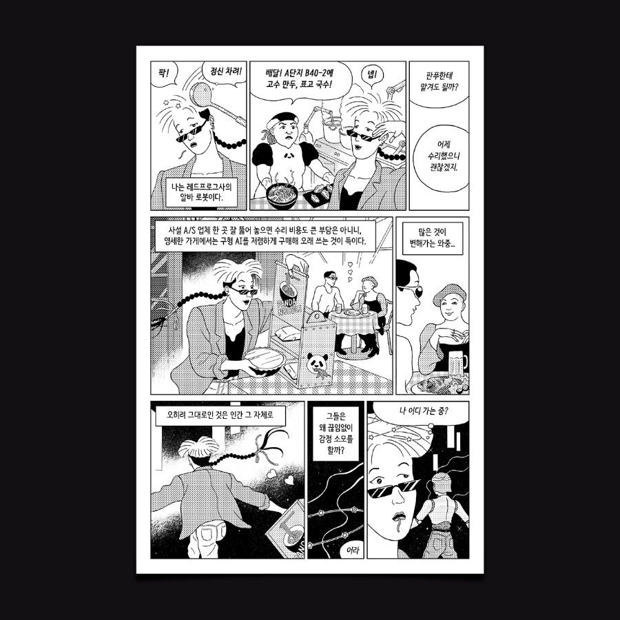 최성민의 「OLD TYPE ROBOT PANSY」는 고장난 인공지능 로봇이 주인공이 되는 만화입니다. ‘판푸’는 퓨전 중화식당에서 일하는 구형 AI입니다. 잔고장이 잦아서 배달 을 나가자마자 금세 식당으로 돌아와 손님 행세를 합니다. 구형 AI인 만큼 단순한 감정이 프로그래밍되어 있어서, 노동로봇 ‘팬지’를 마주치면 한눈에 반하지만, 이 사실 역시 곧잘 잊습니다. 세 장면을 6가지 순서로 6번 읽는 형식을 통해 ‘판푸’가 자꾸만 기억을 까먹어서 같은 상황이 ‘반복’되는 듯한 만화로 연출했습니다.
