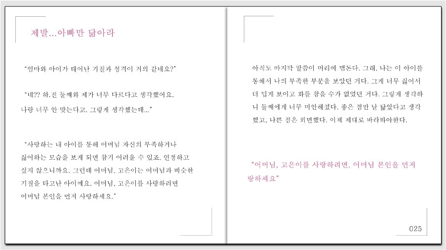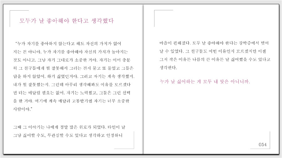-사람들이 나랑 좀 친해지게 되면 날 다시 멀리하는 것 같고 결국 날 싫어하게 되는 것 같다며 난 매력이 없는 사람 같다고 자책했다. 난 나에게 너무 자신이 없었다. 정신과라도 가야겠다고 생각했다. 남편에게 물었다. “난 매력이 도대체 뭐야? 내가 매력이 있긴 해? 누가 날 좋아하긴 할까?” ( 18P-나를 드러내기 전 중 )