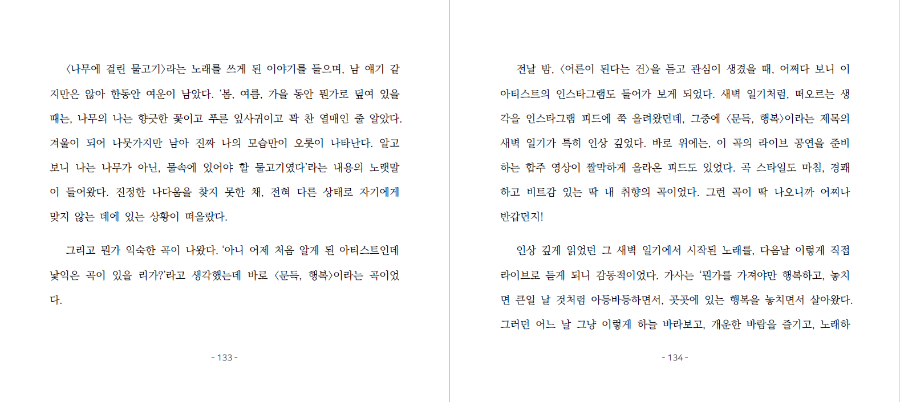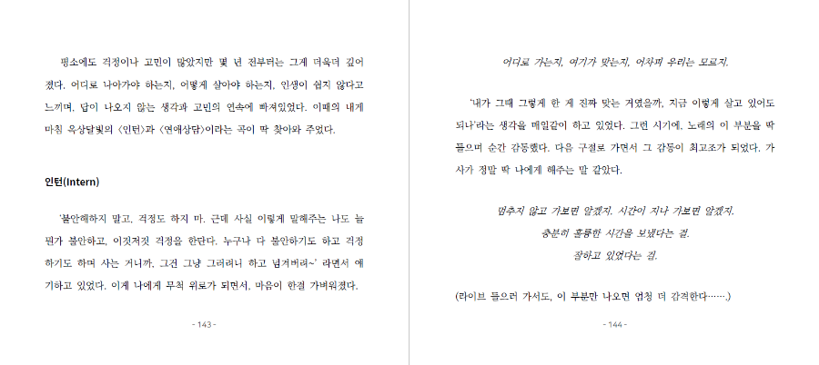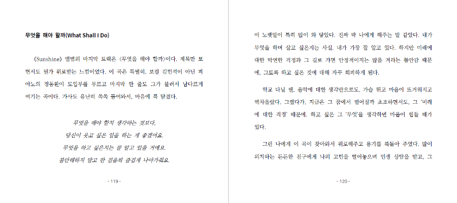 이 노랫말이 특히 많이 와닿았다. 진짜 딱 나에게 해주는 말 같았다. 내가 무엇을 하며 살고 싶은지는 사실, 내가 가장 잘 알고 있다. (중략) 그런 나에게 이 곡이 찾아와서 위로해주고 용기를 북돋아 주었다. 많이 의지하는 든든한 친구에게 나의 고민을 털어놓으며 인생 상담을 받고, 그 친구가 따뜻하게 안아주며 토닥여 주는 듯한 곡이다. 들을 때마다 늘 마음이 뭉클해진다. --- p.120