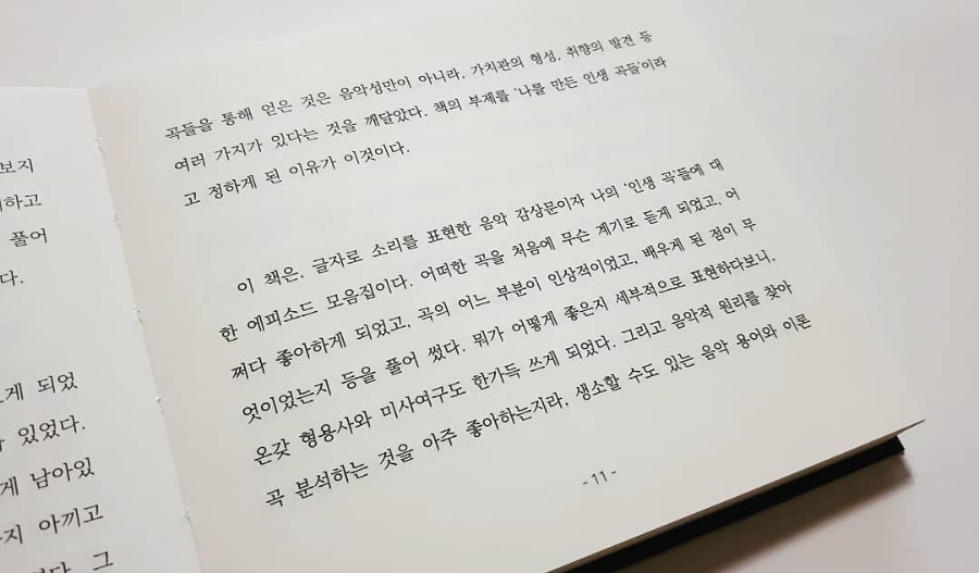이 책에는, 삶에 특별한 의미가 된 어떤 곡을 처음에 무슨 계기로 듣게 되었는지, 어쩌다 좋아하기 시작했는지, 그 곡에서 인상적인 부분이 무엇인지에 대한 감상과 함께,