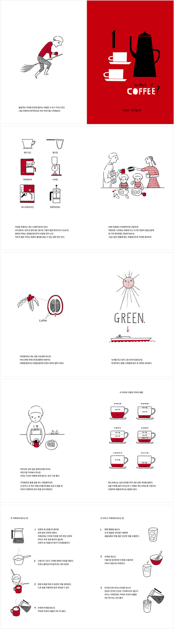 커피 원두의 생산지부터, 다양한 추출 방법과 그에 따른 장단점, 필요한 도구, 그리고 더 맛있는 커피를 내리기 위한 깨알 같은 팁까지, 한 잔의 커피가 만들어지기까지의 일련의 과정이 편안한 그림체와 압축된 문장으로 정리된 이 책을 읽고 나면, 자신만의 커피를 내릴 수 있는 비법 하나를 가지게 될 지도 모르겠다.