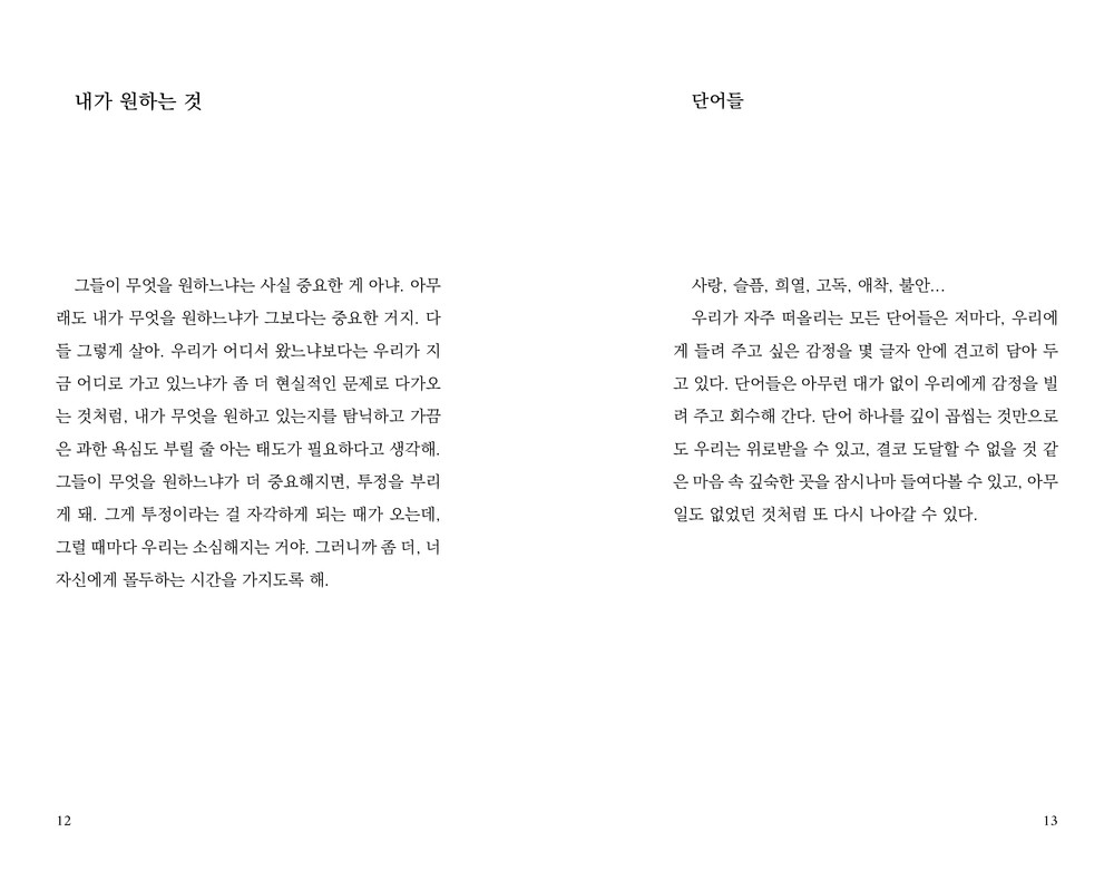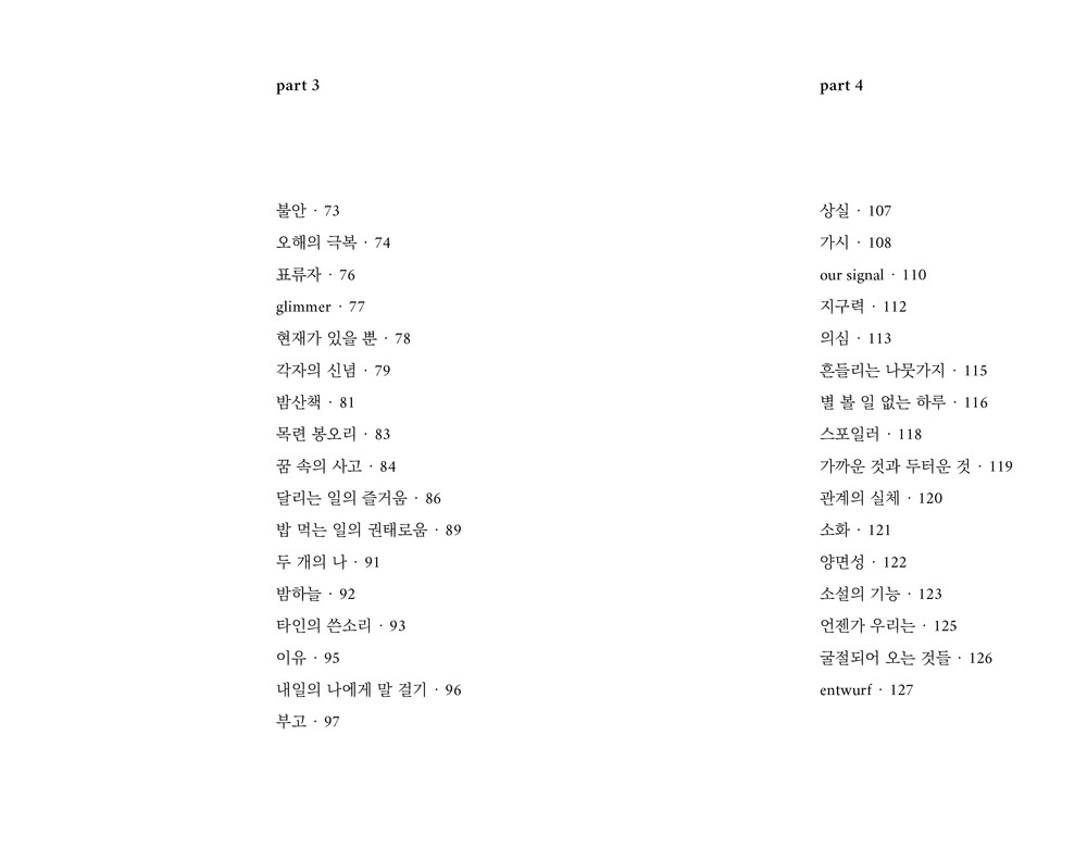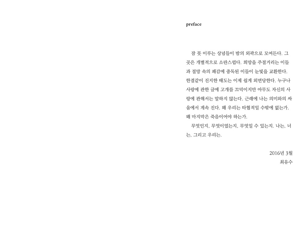 잠 못 이루는 상념들이 밤의 외곽으로 모여든다. 그곳은 개별적으로 소란스럽다. 희망을 주절거리는 이들과 절망 속의 쾌감에 중독된 이들이 눈빛을 교환한다. 한결같이 진지한 태도는 이제 쉽게 외면당한다. 누구나 사랑에 관한 글에 고개를 끄덕이지만 아무도 자신의 사랑에 관해서는 말하지 않는다. 근래에 나는 의미와의 싸움에서 계속 진다. 왜 우리는 타협적일 수밖에 없는가. 왜 마지막은 죽음이어야 하는가.