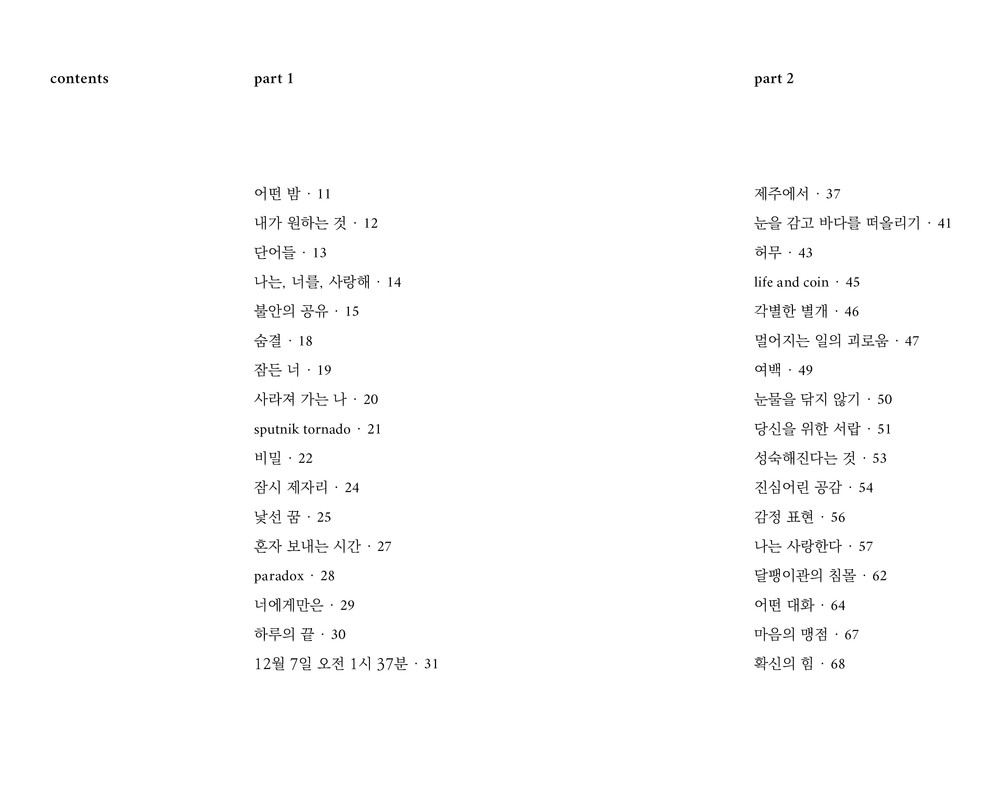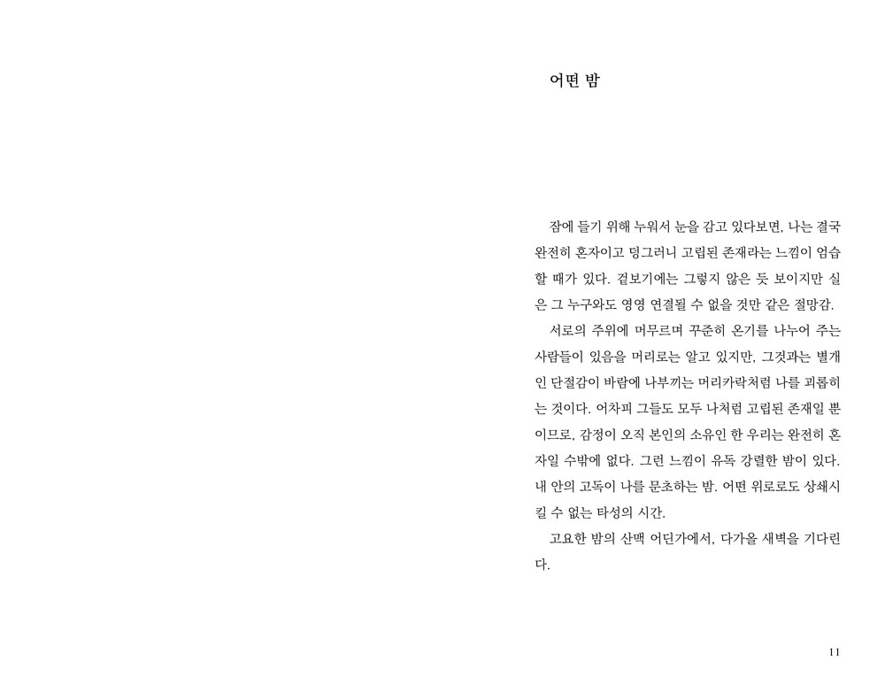 "구겨진 나의 몸과 널브러진 나의 체온을 주워 담는 시간. 하루의 끝에 어김없이 당신과의 시간이 존재한다는 것. 매일 그 시간이 누락없이 반복된다는 것."