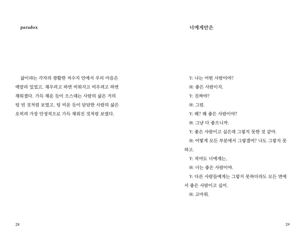 "살아가는 동안 우리는 깊게, 더 깊게 자아의 우물을 파낸다. 그 안에 불안이 차오른다. 들여다 본다. 들여다 보게 한다. 그 바닥이 다 드러나도록 서로의 불완전성이 긴밀하게 공유될 때, 우리는 끝 모르고 깊어진다."