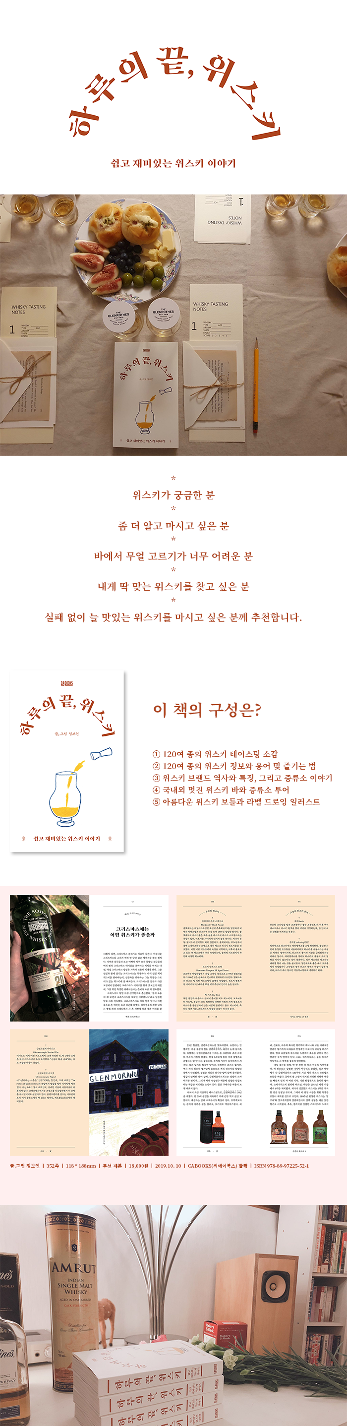 위스키를 하나도 모르던 사람(저자)이 하나씩 맛보며 알아간, 저자의 즐거운 위스키 여정과 직접 경험해 알게 된 ‘살아 있는’ 위스키 정보를 『하루의 끝, 위스키』에 담았습니다. 국내외 위스키 바와 위스키 증류소 현지 투어, 그리고 오랫동안 ‘위스키 스터디’를 진행하면서 직접 맛보고 느끼고 공부하며 체험한 120여 종의 위스키에 관한 이야기입니다.