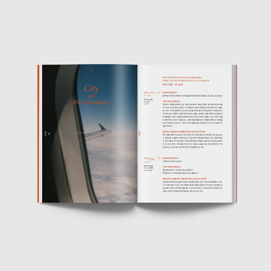 ‘도망치고 달아나는 태도’는 인간관계, 공간, 예술, 여행, 패션 등 다양한 삶의 영역과 맞닿아 있습니다. 죄악의 낙인인 죄수복, 고양이가 가르쳐준 인간관계에 관한 작은 통찰, 내면의 깊은 불안을 증오하면서도 그것을 그림으로 그려내는 어느 유화 작가의 세계관, 영화 <미씽: 사라진 여자>를 통한 ‘사라짐’에 대한 단상, 아이슬란드 여행, 마감에 쫓기며 살아가는 잡지 에디터들이 사랑한 여러 도시들까지. 패션, 여행, 화보, 에세이, 인터뷰, 칼럼 등 때로는 촘촘하고 때로는 느슨하게, 도망 의 여러 의미를 반추해볼 수 있도록 다채로운 이야기들을 마련했습니다.